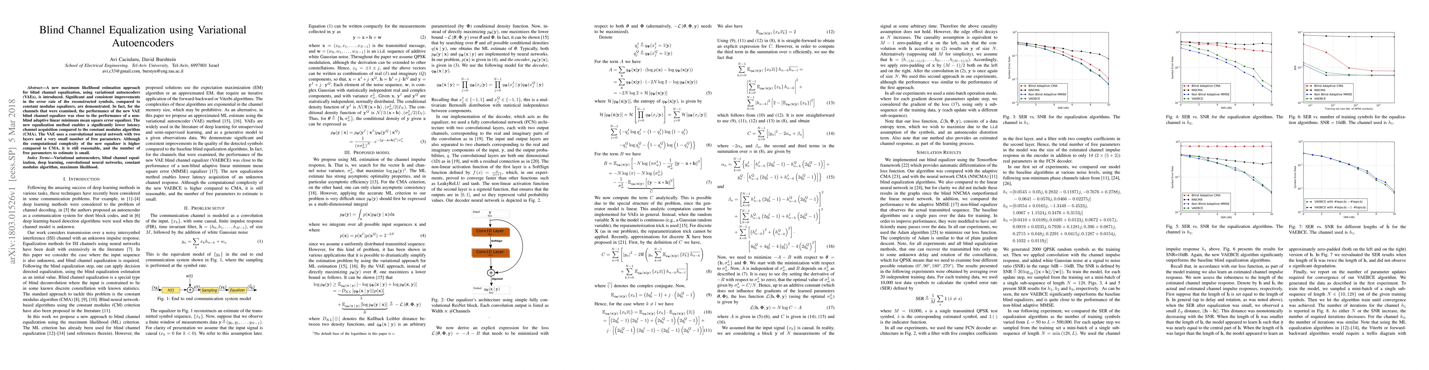 A new maximum likelihood estimation approach for blind channel equalization, using variational autoencoders (VAEs), is introduced. Significant and consistent improvements in the error rate of the reconstructed symbols, compared to constant modulus equalizers, are demonstrated. In fact, for the channels that were examined, the performance of the new VAE blind channel equalizer was close to the performance of a nonblind adaptive linear minimum mean square error equalizer. The new equalization method enables a significantly lower latency channel acquisition compared to the constant modulus algorithm (CMA). The VAE uses a convolutional neural network with two layers and a very small number of free parameters. Although the computational complexity of the new equalizer is higher compared to CMA, it is still reasonable, and the number of free parameters to estimate is small.