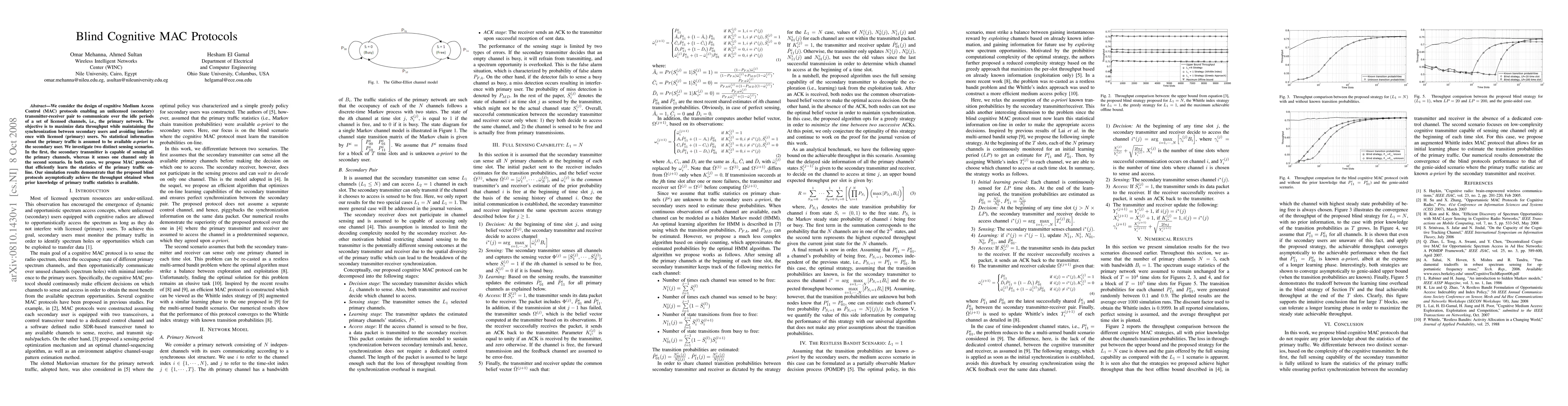 This paper proposes cognitive MAC protocols for unlicensed secondary users to maximize throughput while avoiding interference with licensed primary users, even without prior knowledge of primary traffic. Two sensing scenarios are explored, and the proposed blind protocols achieve near-optimal throughput through online learning of primary traffic statistics.