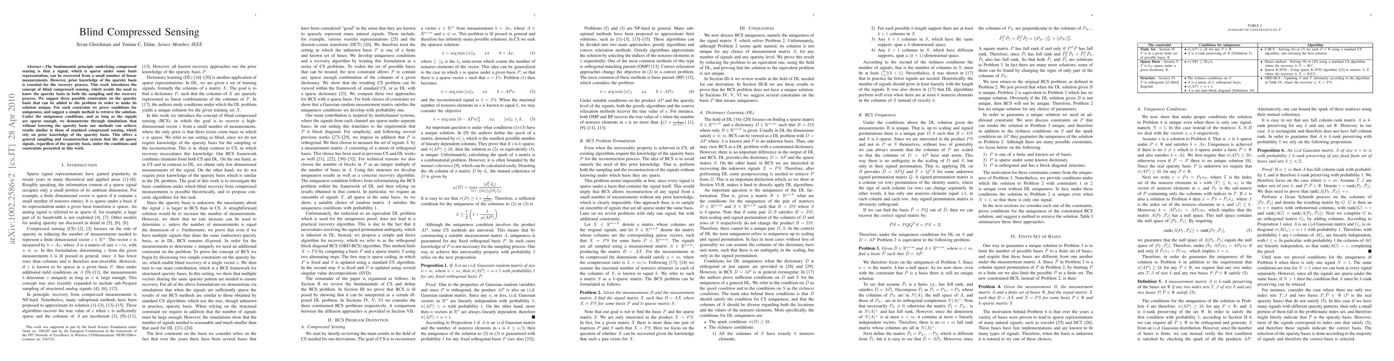 This paper introduces blind compressed sensing, a method that recovers sparse signals from a small number of measurements without prior knowledge of the sparsity basis. It proposes three constraints to ensure uniqueness and presents methods to retrieve solutions, demonstrating through simulations that it can achieve comparable results to standard compressed sensing.