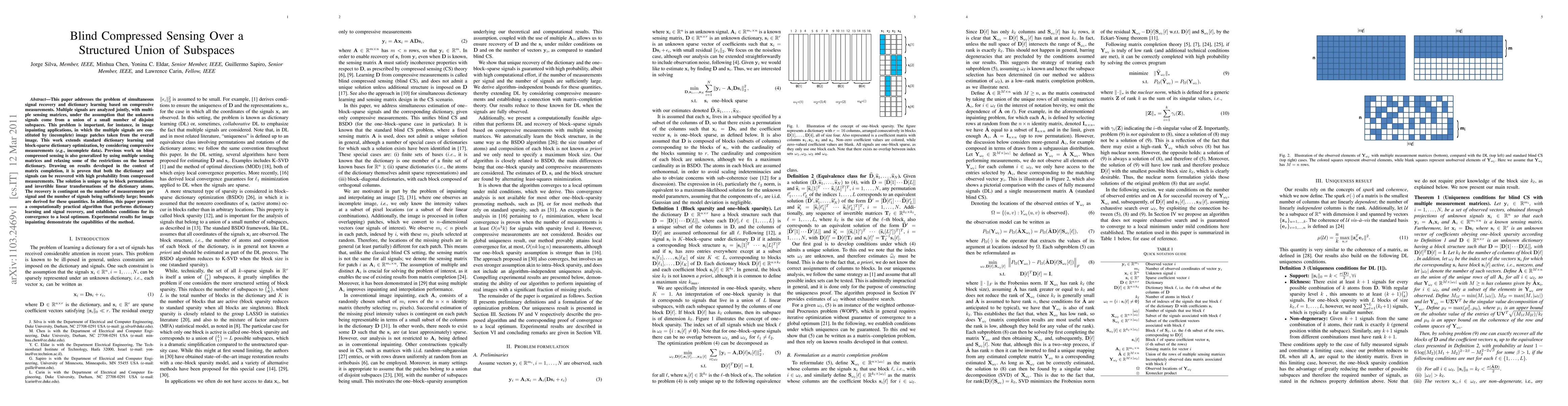 This paper proposes a method for simultaneous signal recovery and dictionary learning from compressive measurements, where signals come from a union of subspaces. It extends traditional dictionary learning to handle multiple sensing matrices and proves high-probability recovery of both the dictionary and signals under certain conditions.