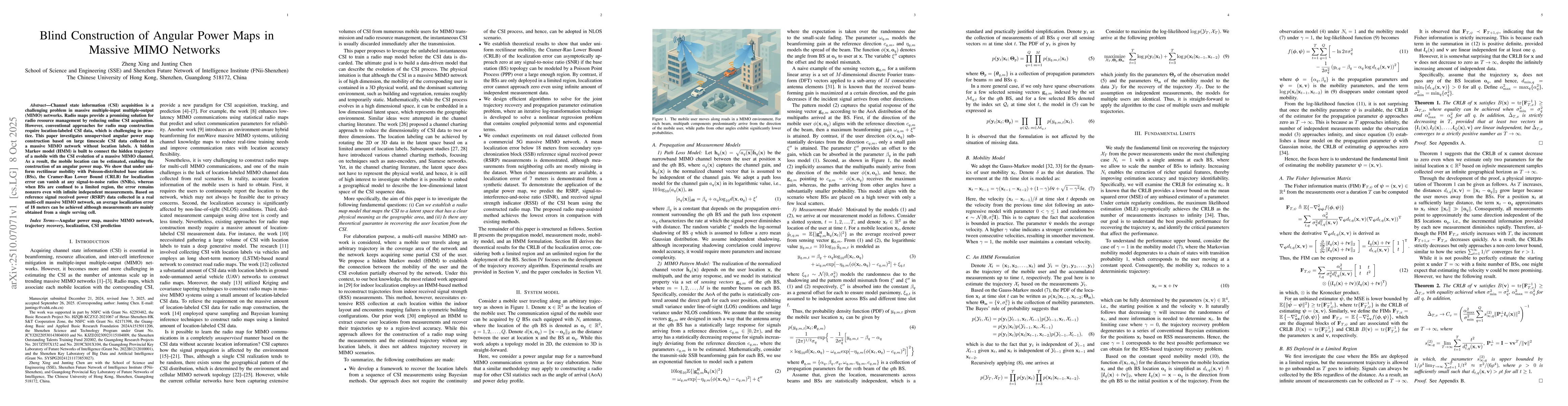 Introduces a method for constructing angular power maps without location labels, combining mobility modeling with HMM-based RSRP embedding. Demonstrates theoretical guarantees for localization error convergence under specific mobility and BS deployment patterns.
