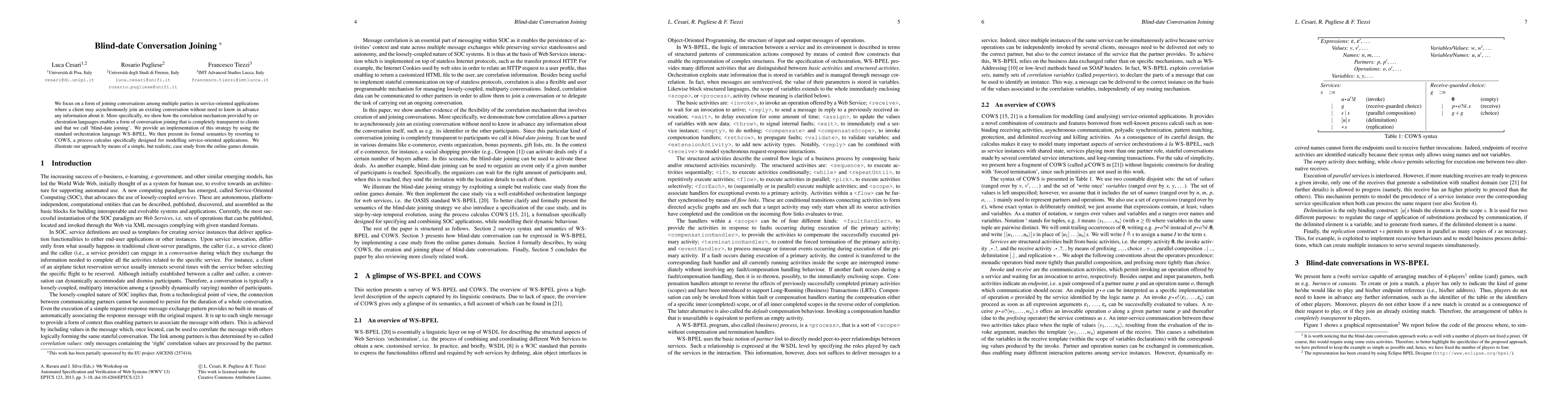 We focus on a form of joining conversations among multiple parties in service-oriented applications where a client may asynchronously join an existing conversation without need to know in advance any information about it. More specifically, we show how the correlation mechanism provided by orchestration languages enables a form of conversation joining that is completely transparent to clients and that we call 'blind-date joining'. We provide an implementation of this strategy by using the standard orchestration language WS-BPEL. We then present its formal semantics by resorting to COWS, a process calculus specifically designed for modelling service-oriented applications. We illustrate our approach by means of a simple, but realistic, case study from the online games domain.