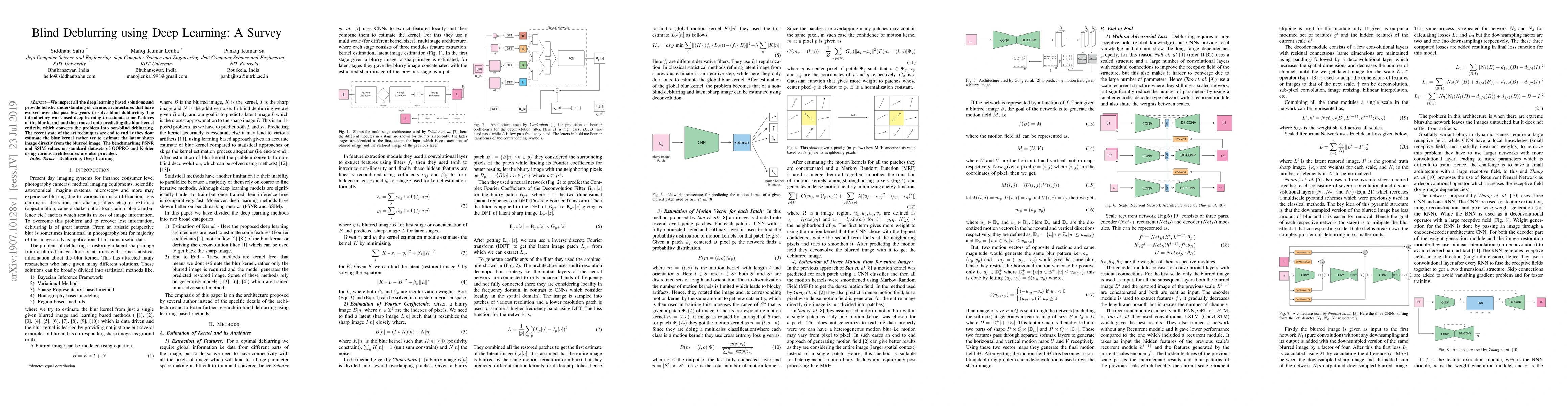 This paper surveys deep learning techniques for blind deblurring, tracing the evolution from estimating blur kernels to end-to-end methods that directly predict sharp images. Benchmarking results using PSNR and SSIM on standard datasets highlight the advancements in this field.