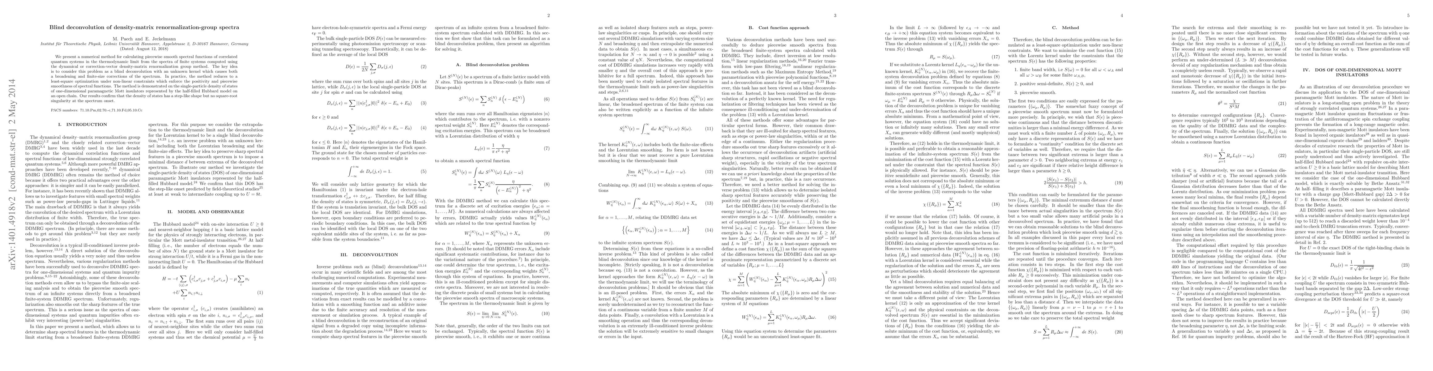 We present a numerical method for calculating piecewise smooth spectral functions of correlated quantum systems in the thermodynamic limit from the spectra of finite systems computed using the dynamical or correction-vector density-matrix renormalization group method. The key idea is to consider this problem as a blind deconvolution with an unknown kernel which causes both a broadening and finite-size corrections of the spectrum. In practice, the method reduces to a least-square optimization under non-linear constraints which enforce the positivity and piecewise smoothness of spectral functions. The method is demonstrated on the single-particle density of states of one-dimensional paramagnetic Mott insulators represented by the half-filled Hubbard model on an open chain. Our results confirm that the density of states has a step-like shape but no square-root singularity at the spectrum onset.