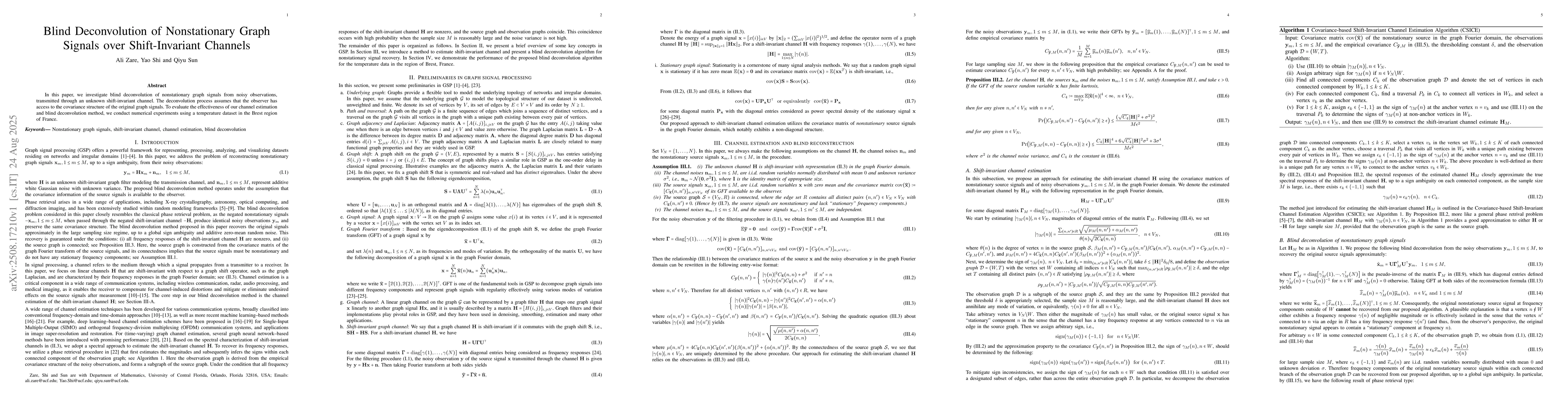 In this paper, we investigate blind deconvolution of nonstationary graph signals from noisy observations, transmitted through an unknown shift-invariant channel. The deconvolution process assumes that the observer has access to the covariance structure of the original graph signals. To evaluate the effectiveness of our channel estimation and blind deconvolution method, we conduct numerical experiments using a temperature dataset in the Brest region of France.