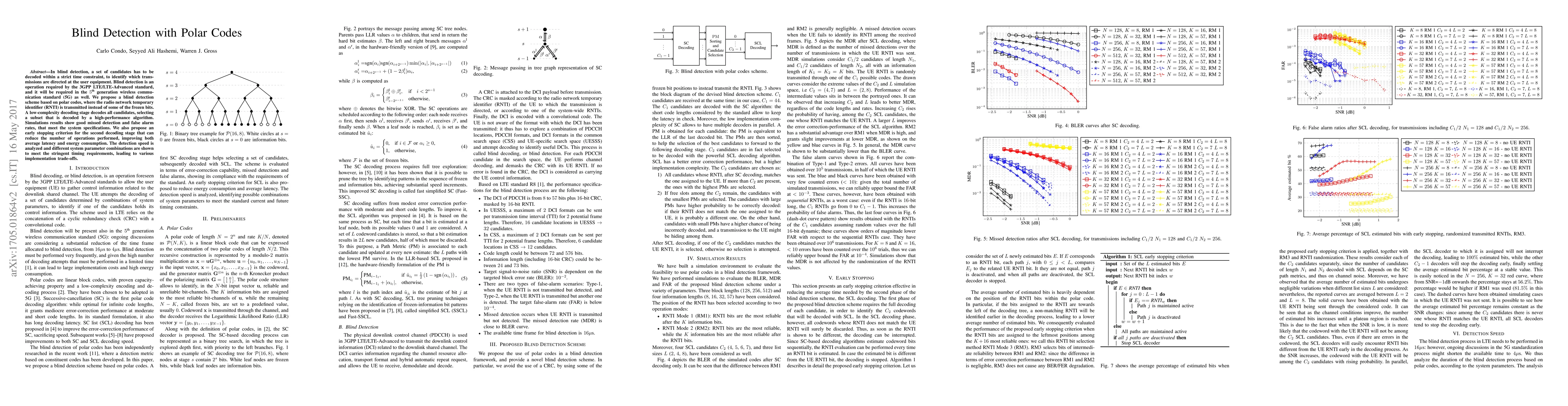 In blind detection, a set of candidates has to be decoded within a strict time constraint, to identify which transmissions are directed at the user equipment. Blind detection is an operation required by the 3GPP LTE/LTE-Advanced standard, and it will be required in the 5th generation wireless communication standard (5G) as well. We propose a blind detection scheme based on polar codes, where the radio network temporary identifier (RNTI) is transmitted instead of some of the frozen bits. A low-complexity decoding stage decodes all candidates, selecting a subset that is decoded by a high-performance algorithm. Simulations results show good missed detection and false alarm rates, that meet the system specifications. We also propose an early stopping criterion for the second decoding stage that can reduce the number of operations performed, improving both average latency and energy consumption. The detection speed is analyzed and different system parameter combinations are shown to meet the stringent timing requirements, leading to various implementation trade-offs.