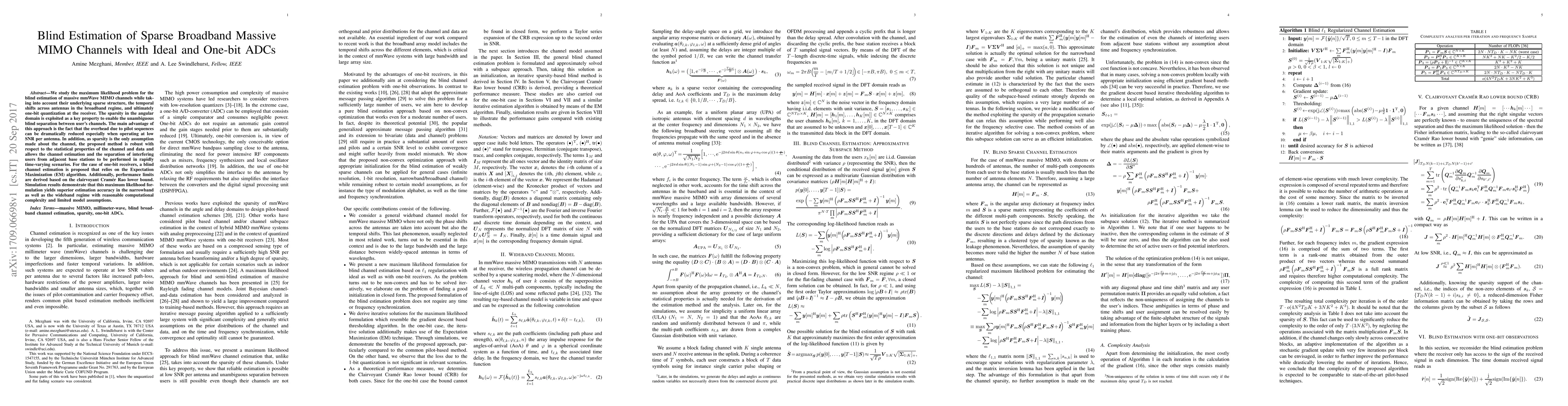 We study the maximum likelihood problem for the blind estimation of massive mmWave MIMO channels while taking into account their underlying sparse structure, the temporal shifts across antennas in the broadband regime, and ultimately one-bit quantization at the receiver. The sparsity in the angular domain is exploited as a key property to enable the unambiguous blind separation between user's channels. The main advantage of this approach is the fact that the overhead due to pilot sequences can be dramatically reduced especially when operating at low SNR per antenna. In addition, as sparsity is the only assumption made about the channel, the proposed method is robust with respect to the statistical properties of the channel and data and allows the channel estimation and the separation of interfering users from adjacent base stations to be performed in rapidly time-varying scenarios. For the case of one-bit receivers, a blind channel estimation is proposed that relies on the Expectation Maximization (EM) algorithm. Additionally, performance limits are derived based on the clairvoyant Cramer Rao lower bound. Simulation results demonstrate that this maximum likelihood formulation yields superior estimation accuracy in the narrowband as well as the wideband regime with reasonable computational complexity and limited model assumptions.