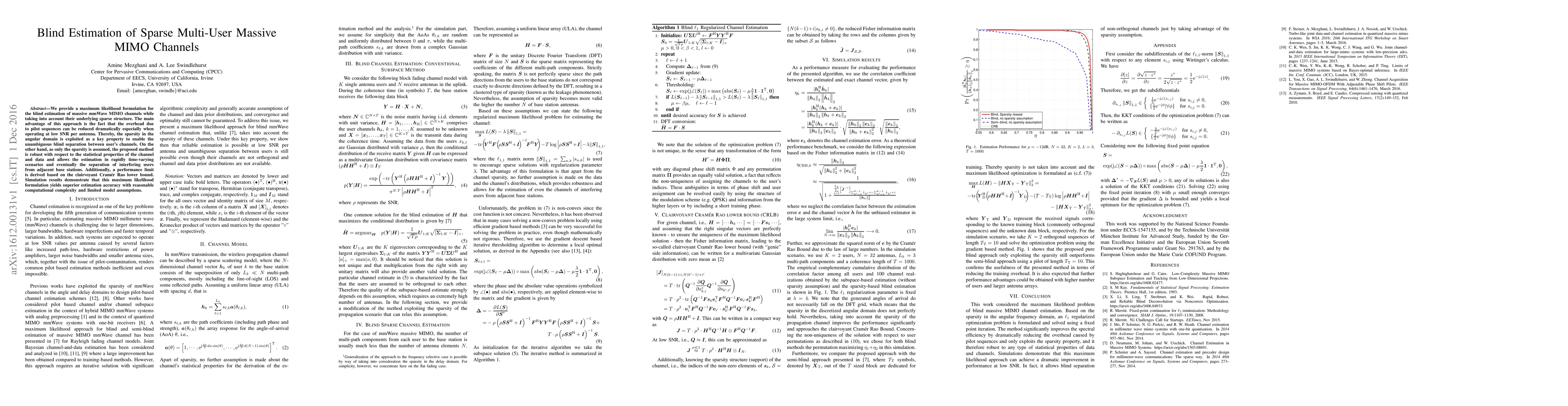 This paper proposes a maximum likelihood method for blind estimation of sparse multi-user massive MIMO channels at mmWave frequencies, significantly reducing pilot overhead and enabling robust estimation in time-varying scenarios. Simulation results show superior accuracy and manageable computational complexity.