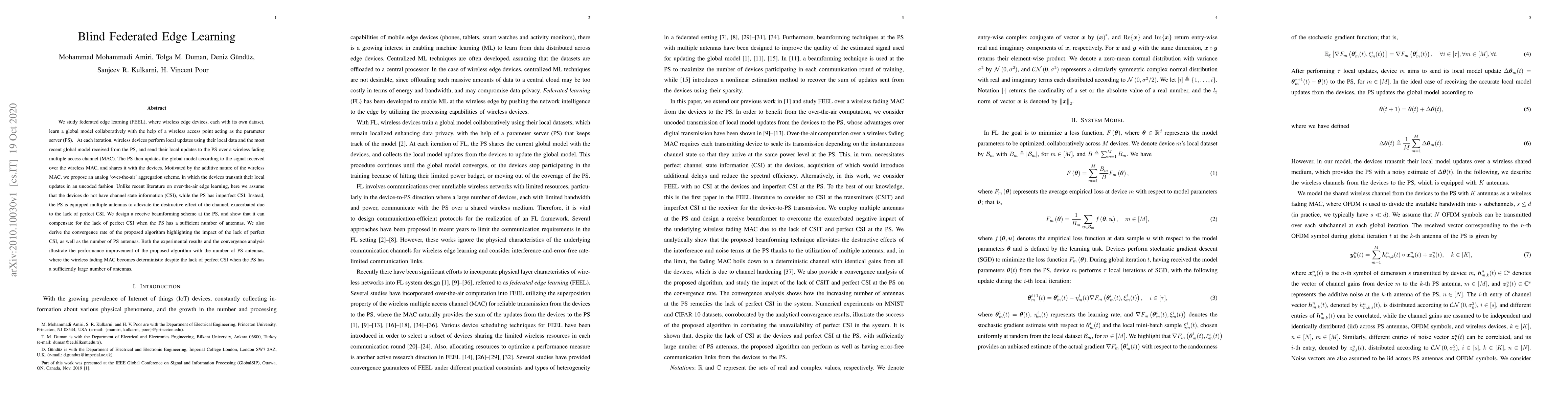 Researchers propose a new method for federated edge learning that enables devices to learn from each other without knowing the channel conditions between them. The algorithm improves performance with more antennas at the parameter server, even when channel information is imperfect.