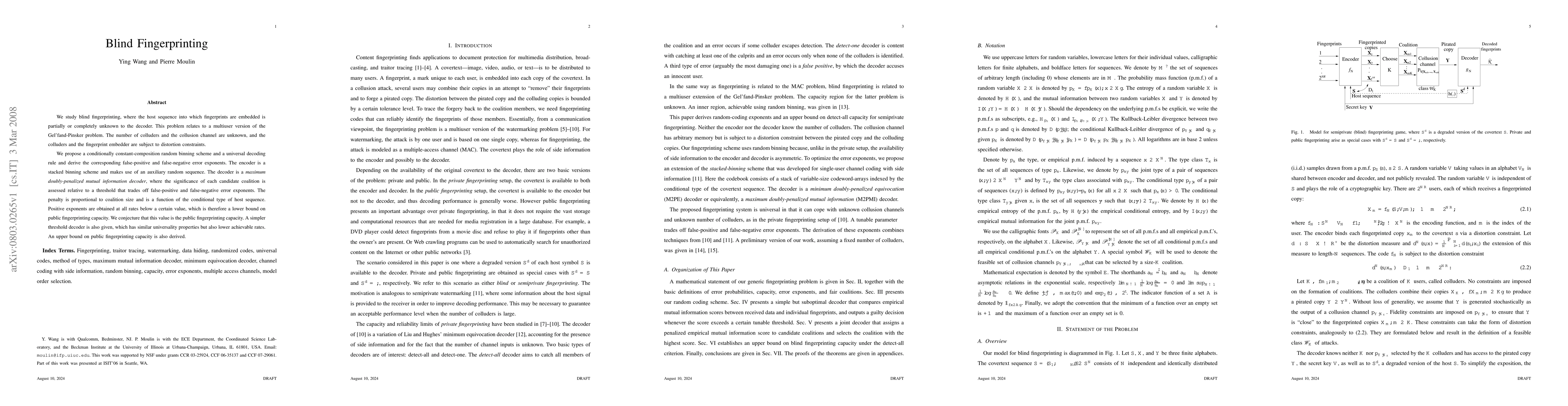 We study blind fingerprinting, where the host sequence into which fingerprints are embedded is partially or completely unknown to the decoder. This problem relates to a multiuser version of the Gel'fand-Pinsker problem. The number of colluders and the collusion channel are unknown, and the colluders and the fingerprint embedder are subject to distortion constraints. We propose a conditionally constant-composition random binning scheme and a universal decoding rule and derive the corresponding false-positive and false-negative error exponents. The encoder is a stacked binning scheme and makes use of an auxiliary random sequence. The decoder is a {\em maximum doubly-penalized mutual information decoder}, where the significance of each candidate coalition is assessed relative to a threshold that trades off false-positive and false-negative error exponents. The penalty is proportional to coalition size and is a function of the conditional type of host sequence. Positive exponents are obtained at all rates below a certain value, which is therefore a lower bound on public fingerprinting capacity. We conjecture that this value is the public fingerprinting capacity. A simpler threshold decoder is also given, which has similar universality properties but also lower achievable rates. An upper bound on public fingerprinting capacity is also derived.