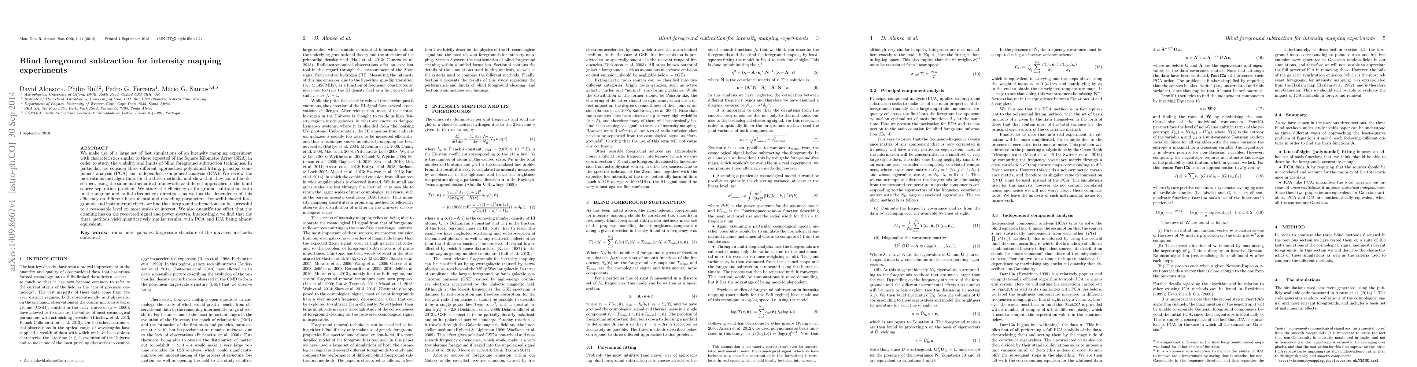 This paper investigates the effectiveness of blind foreground subtraction techniques—polynomial fitting, PCA, and ICA—for intensity mapping experiments, particularly for the SKA. The study finds that these methods yield similar results, with PCA and ICA performing almost equivalently, and that foreground subtraction is successful on most scales of interest for well-behaved foregrounds and instrumental effects.