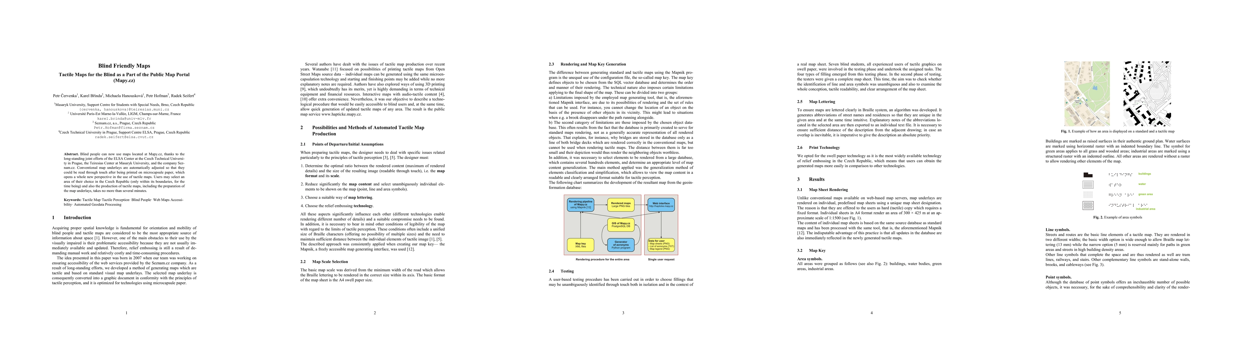 Blind people can now use maps located at Mapy.cz, thanks to the long-standing joint efforts of the ELSA Center at the Czech Technical University in Prague, the Teiresias Center at Masaryk University, and the company Seznam.cz. Conventional map underlays are automatically adjusted so that they could be read through touch after being printed on microcapsule paper, which opens a whole new perspective in the use of tactile maps. Users may select an area of their choice in the Czech Republic (only within its boundaries, for the time being) and also the production of tactile maps, including the preparation of the map underlays, takes no more than several minutes.