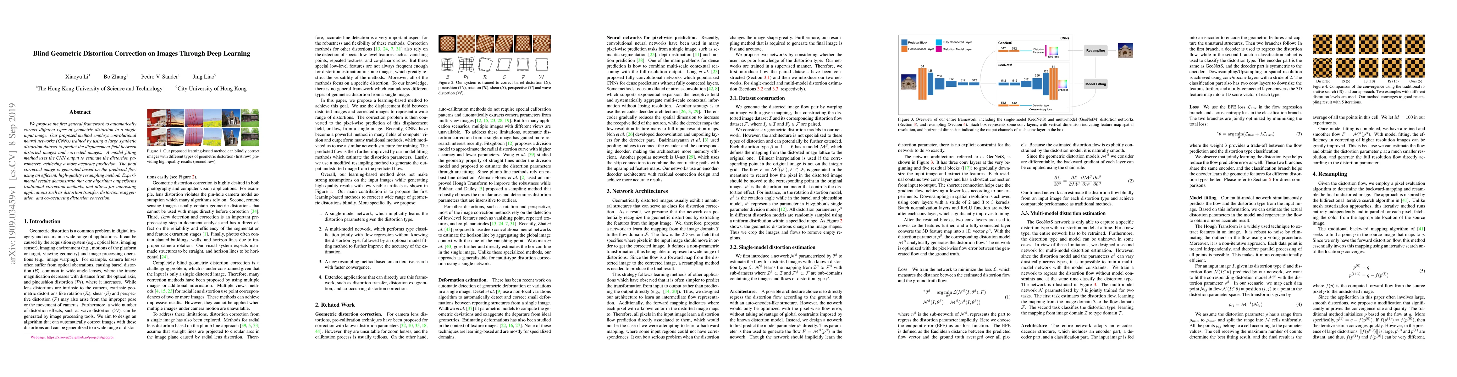 This paper introduces a deep learning framework using CNNs to automatically correct various geometric distortions in images. The method predicts displacement fields and estimates distortion parameters, leading to high-quality resampled corrected images that outperform traditional methods.