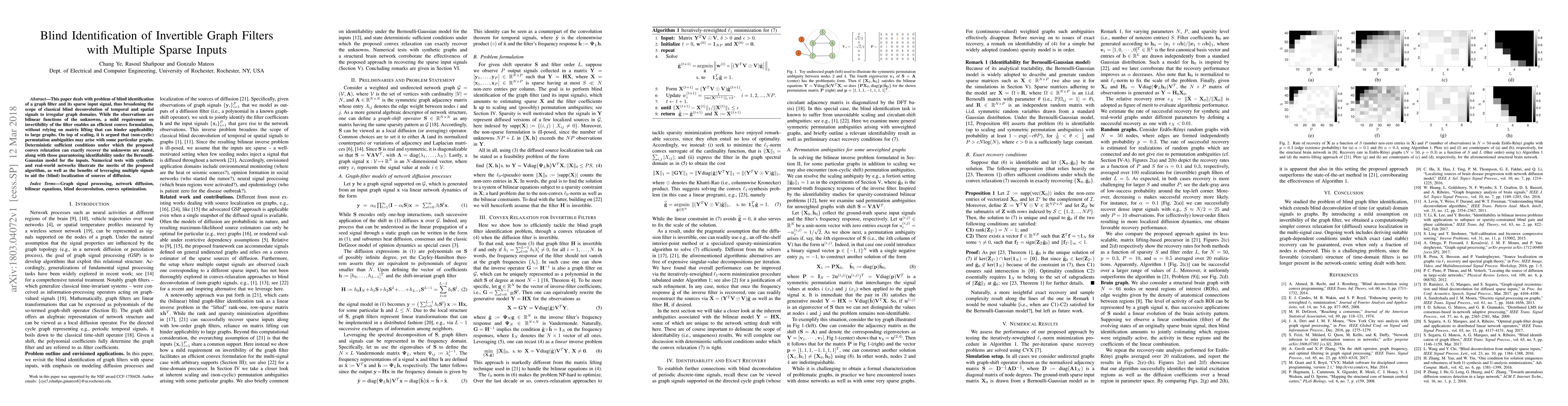 This paper proposes a method for blind identification of invertible graph filters and their sparse input signals, extending classical blind deconvolution to graph domains. It leverages a convex formulation to efficiently handle large graphs, while addressing potential permutation ambiguities and providing conditions for exact recovery and identifiability under a Bernoulli-Gaussian input model.