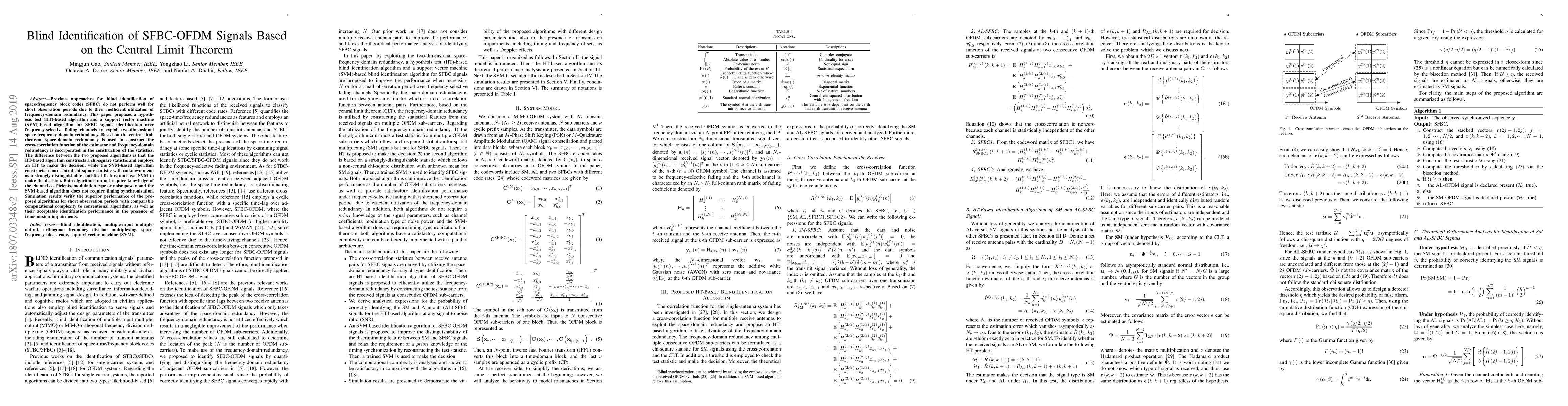 This paper proposes two algorithms for blind identification of SFBC-OFDM signals: a hypothesis test-based and a support vector machine-based approach. Both exploit two-dimensional space-frequency redundancy, leveraging the central limit theorem for improved performance in short observation periods.