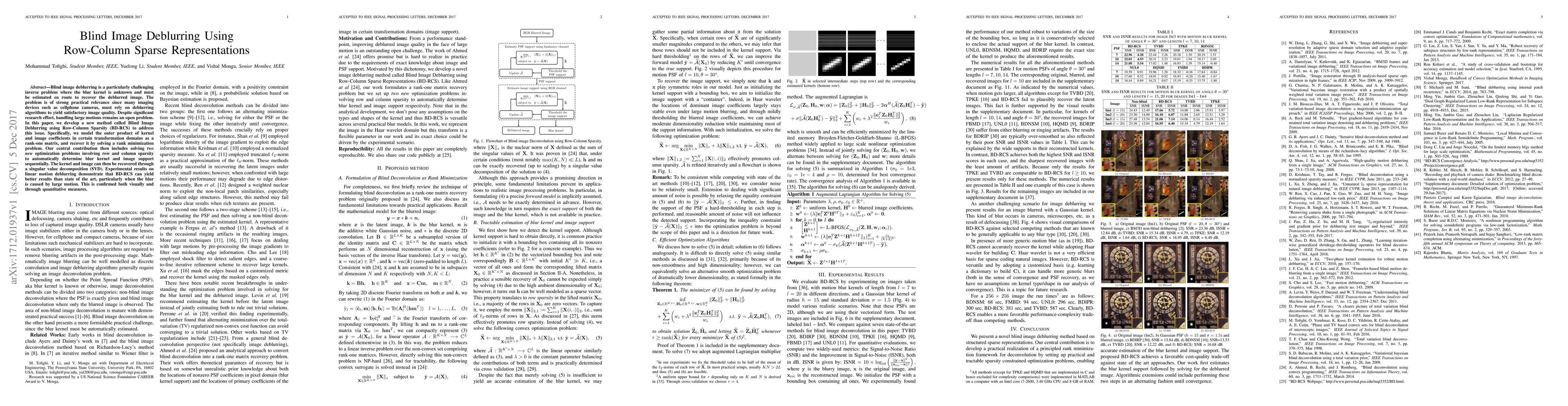 This paper introduces a novel method called BD-RCS for blind image deblurring, leveraging row-column sparsity to estimate unknown blur kernels and recover deblurred images. The method outperforms existing techniques, especially for large motion blurs, as demonstrated by both visual and quantitative results.