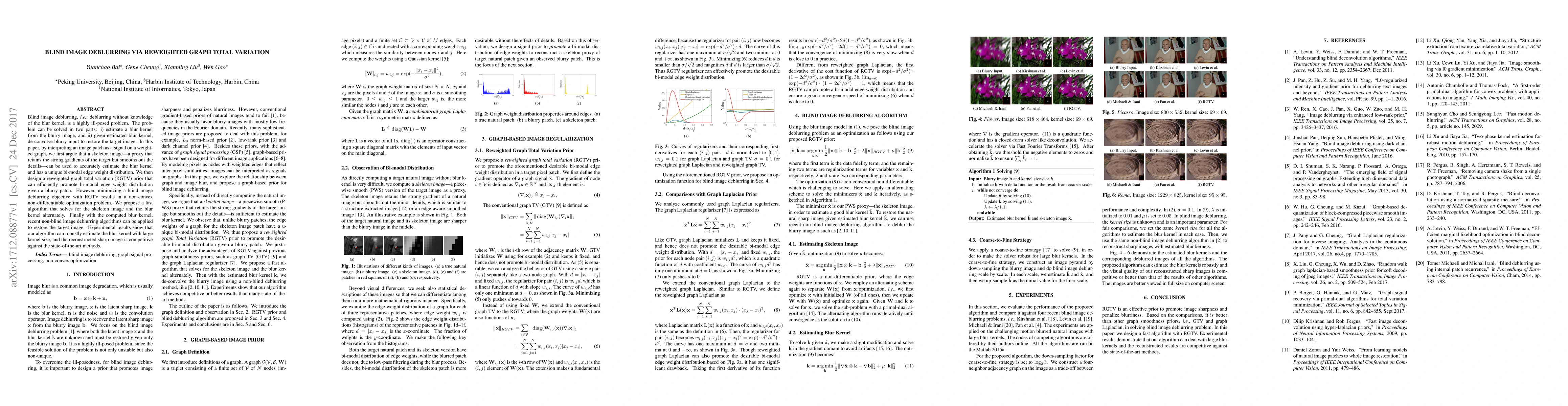 This paper proposes a method for blind image deblurring using a reweighted graph total variation (RGTV) prior to estimate the blur kernel and reconstruct the target image. The method alternates between solving for the skeleton image and the blur kernel, leading to robust kernel estimation and competitive deblurring results.