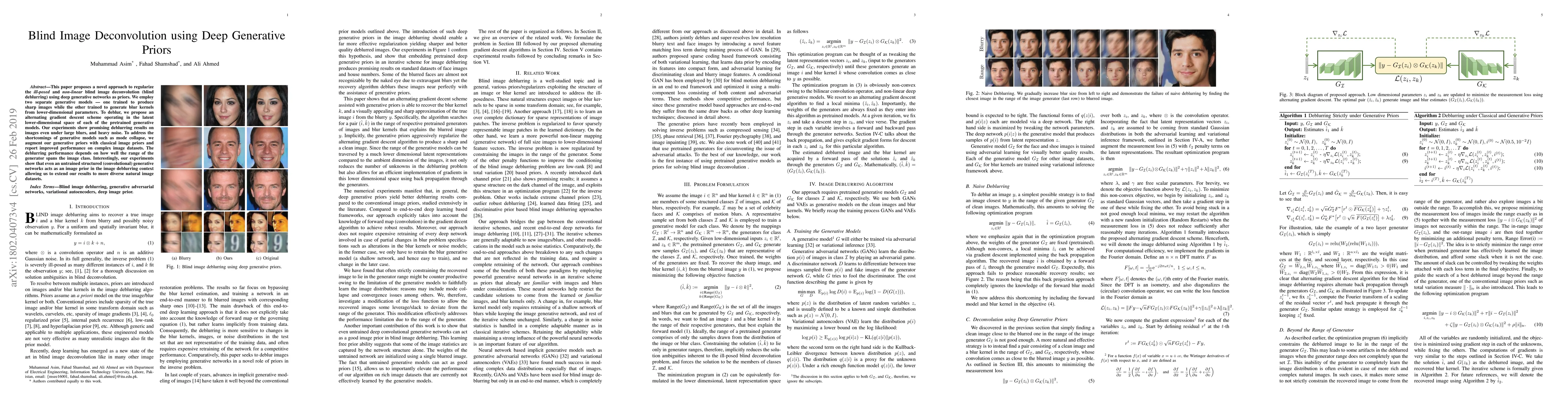 This paper introduces a method for blind image deconvolution using deep generative networks as priors, employing two generative models to produce sharp images and blur kernels. The proposed alternating gradient descent scheme in the latent space of these models yields effective deblurring results even under significant blurs and noise.