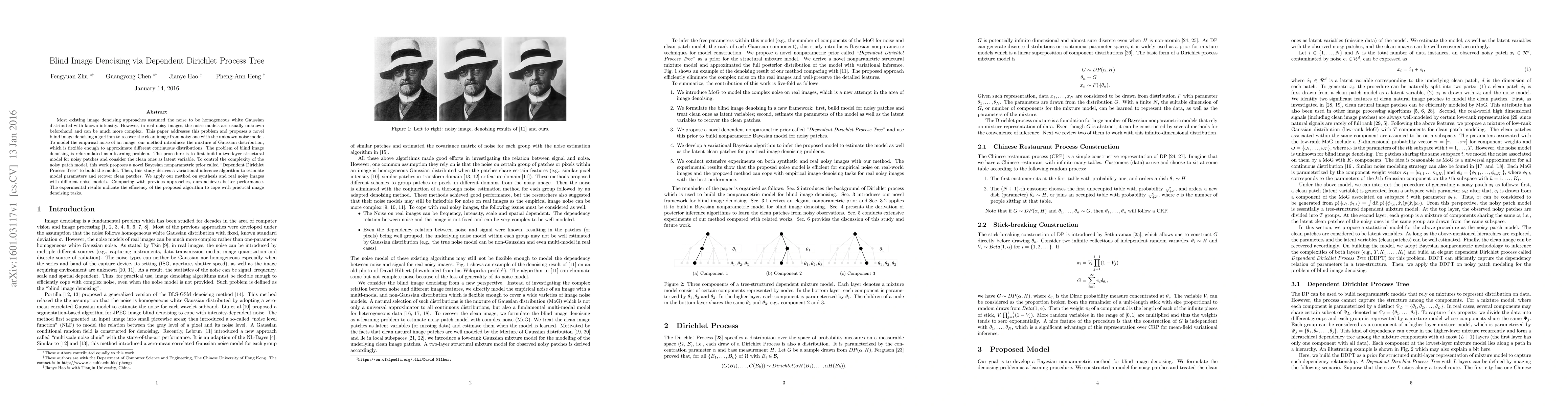This paper proposes a novel blind image denoising algorithm using a mixture of Gaussian distributions and a Dependent Dirichlet Process Tree to model unknown noise. The method reformulates denoising as a learning problem, achieving better performance compared to previous approaches on both synthetic and real images.