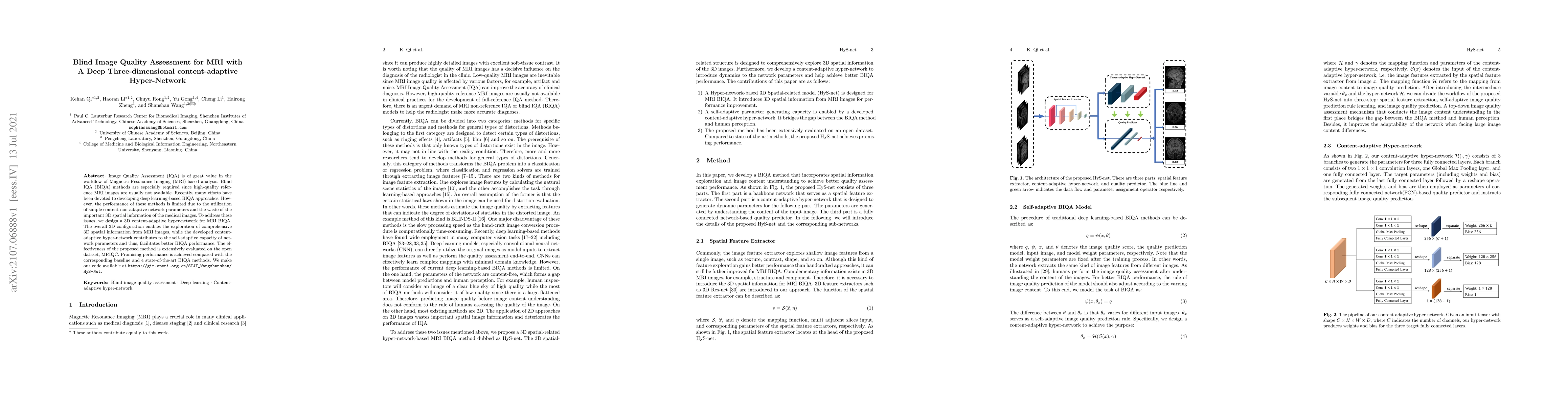 This paper proposes a 3D content-adaptive hyper-network for blind image quality assessment (BIQA) in MRI, addressing limitations of existing methods by leveraging comprehensive 3D spatial information and adaptive network parameters. The method outperforms baselines and state-of-the-art BIQA techniques on the MRIQC dataset.