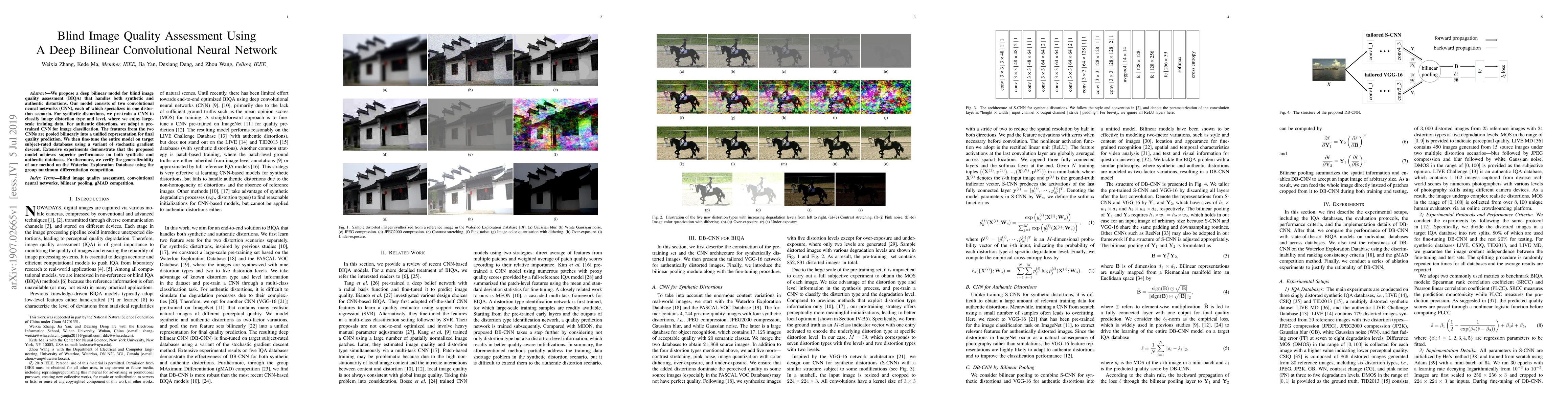 This paper proposes a deep bilinear convolutional neural network for blind image quality assessment, combining two specialized CNNs for synthetic and authentic distortions, and achieving superior performance on both types of databases. The model's generalizability is validated through competitive results on the Waterloo Exploration Database.