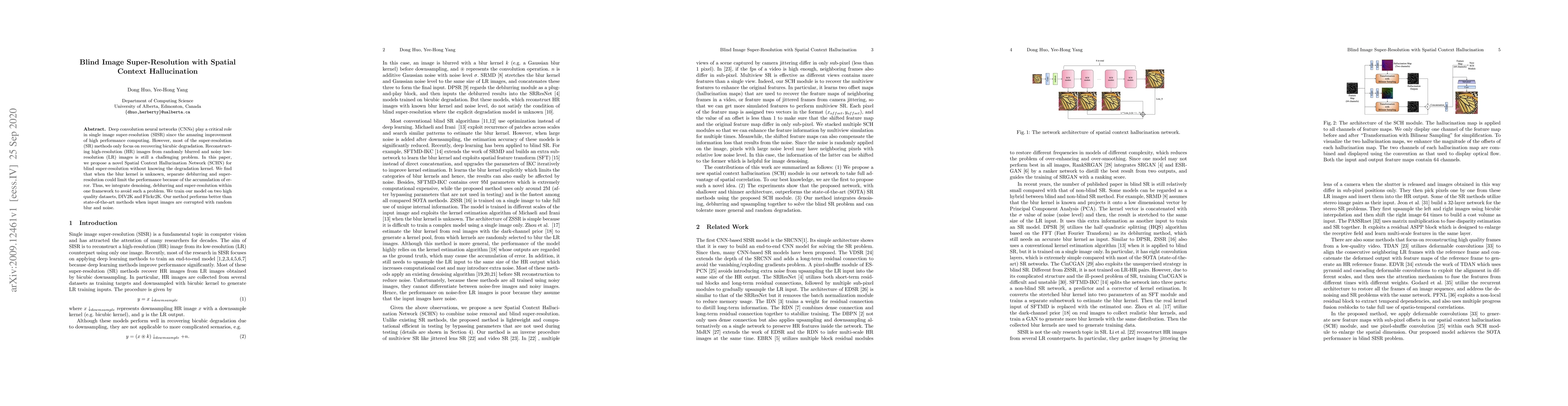 This paper introduces a Spatial Context Hallucination Network (SCHN) for blind image super-resolution, integrating denoising, deblurring, and super-resolution within a single framework to improve performance on randomly blurred and noisy low-resolution images. The proposed method outperforms state-of-the-art techniques on DIV2K and Flickr2K datasets.