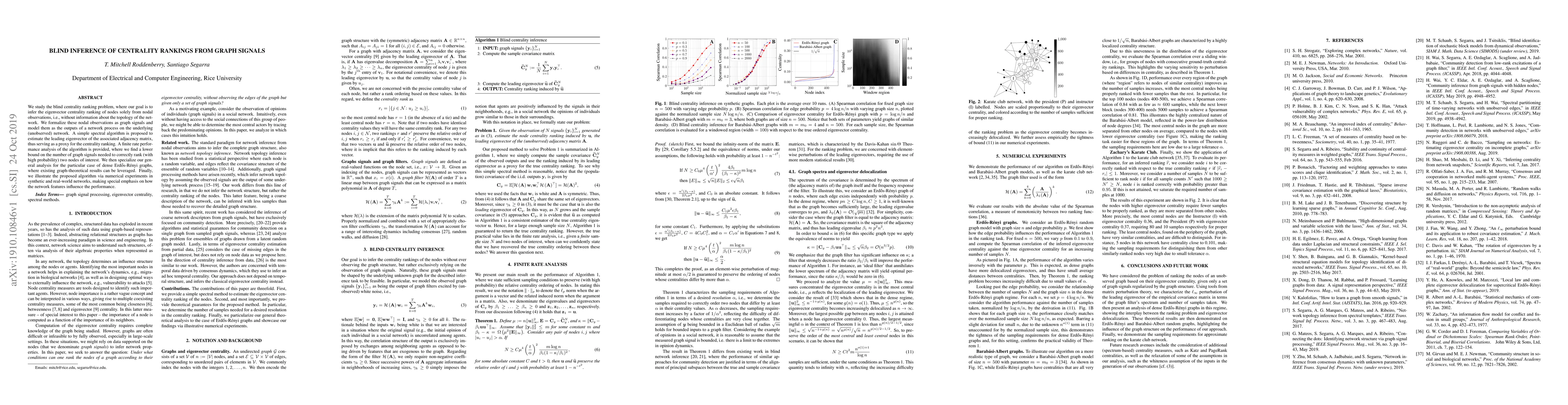 We study the blind centrality ranking problem, where our goal is to infer the eigenvector centrality ranking of nodes solely from nodal observations, i.e., without information about the topology of the network. We formalize these nodal observations as graph signals and model them as the outputs of a network process on the underlying (unobserved) network. A simple spectral algorithm is proposed to estimate the leading eigenvector of the associated adjacency matrix, thus serving as a proxy for the centrality ranking. A finite rate performance analysis of the algorithm is provided, where we find a lower bound on the number of graph signals needed to correctly rank (with high probability) two nodes of interest. We then specialize our general analysis for the particular case of dense \ER graphs, where existing graph-theoretical results can be leveraged. Finally, we illustrate the proposed algorithm via numerical experiments in synthetic and real-world networks, making special emphasis on how the network features influence the performance.