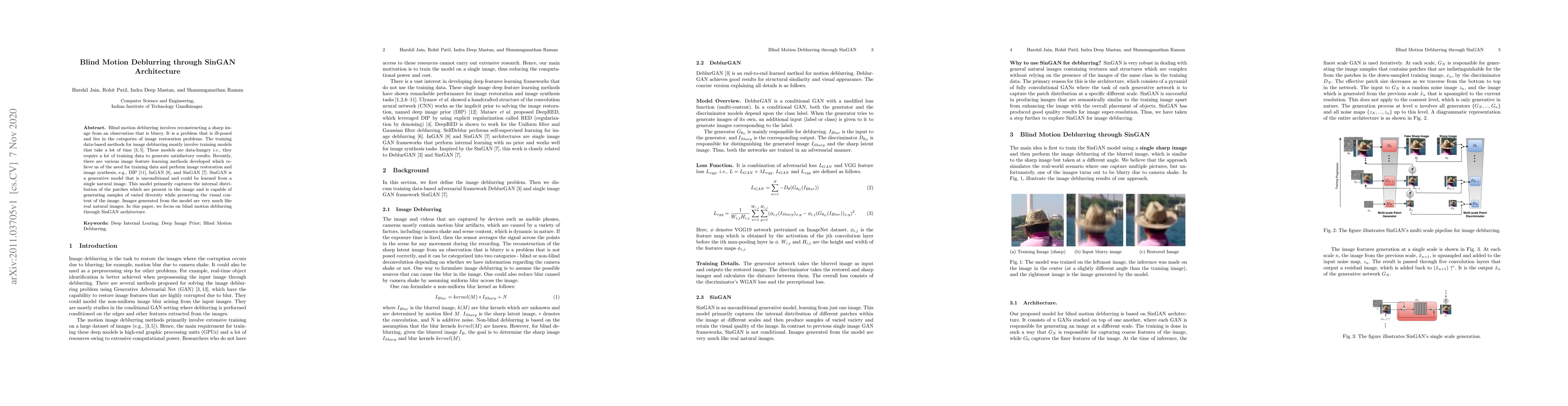 Blind motion deblurring involves reconstructing a sharp image from an observation that is blurry. It is a problem that is ill-posed and lies in the categories of image restoration problems. The training data-based methods for image deblurring mostly involve training models that take a lot of time. These models are data-hungry i.e., they require a lot of training data to generate satisfactory results. Recently, there are various image feature learning methods developed which relieve us of the need for training data and perform image restoration and image synthesis, e.g., DIP, InGAN, and SinGAN. SinGAN is a generative model that is unconditional and could be learned from a single natural image. This model primarily captures the internal distribution of the patches which are present in the image and is capable of generating samples of varied diversity while preserving the visual content of the image. Images generated from the model are very much like real natural images. In this paper, we focus on blind motion deblurring through SinGAN architecture.