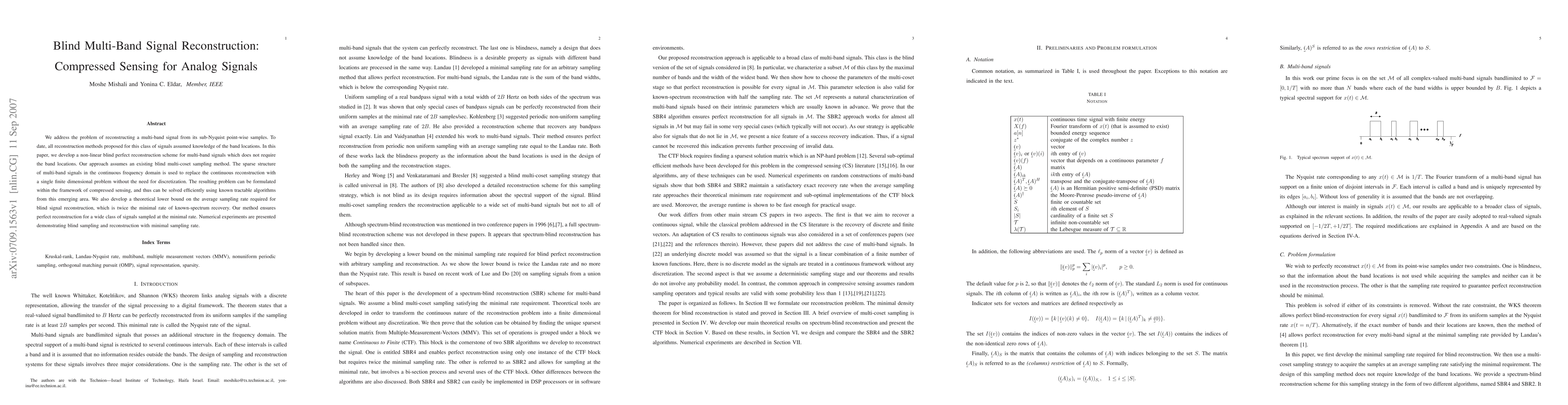 This paper proposes a novel blind reconstruction method for multi-band signals using compressed sensing, eliminating the need for prior knowledge of band locations. It leverages the sparse structure of signals in the continuous frequency domain to solve the reconstruction problem efficiently.