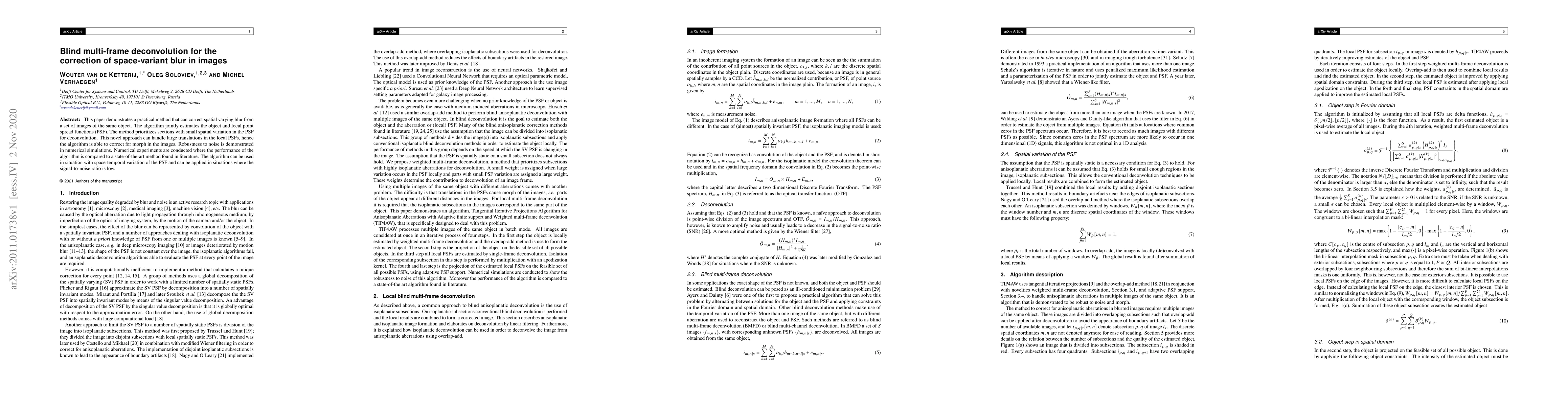 This paper demonstrates a practical method that can correct spatial varying blur from a set of images of the same object. The algorithm jointly estimates the object and local point spread functions~(PSF). The method prioritizes sections with small spatial variation in the PSF for deconvolution. This novel approach can handle large translations in the local PSFs, hence the algorithm is able to correct for morph in the images. Robustness to noise is demonstrated in numerical simulations. Numerical experiments are conducted where the performance of the algorithm is compared to a state-of-the-art method found in literature. The algorithm can be used in situation with space-temporal variation of the PSF and can be applied in situations where the signal-to-noise ratio is low.
