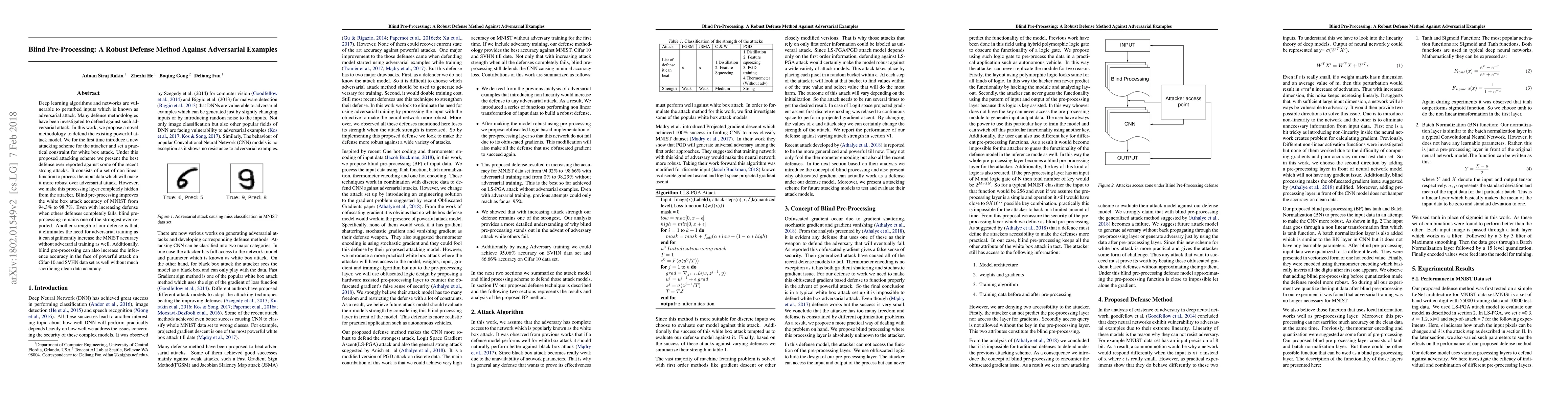 Deep learning algorithms and networks are vulnerable to perturbed inputs which is known as the adversarial attack. Many defense methodologies have been investigated to defend against such adversarial attack. In this work, we propose a novel methodology to defend the existing powerful attack model. We for the first time introduce a new attacking scheme for the attacker and set a practical constraint for white box attack. Under this proposed attacking scheme, we present the best defense ever reported against some of the recent strong attacks. It consists of a set of nonlinear function to process the input data which will make it more robust over the adversarial attack. However, we make this processing layer completely hidden from the attacker. Blind pre-processing improves the white box attack accuracy of MNIST from 94.3\% to 98.7\%. Even with increasing defense when others defenses completely fail, blind pre-processing remains one of the strongest ever reported. Another strength of our defense is that it eliminates the need for adversarial training as it can significantly increase the MNIST accuracy without adversarial training as well. Additionally, blind pre-processing can also increase the inference accuracy in the face of a powerful attack on CIFAR-10 and SVHN data set as well without much sacrificing clean data accuracy.