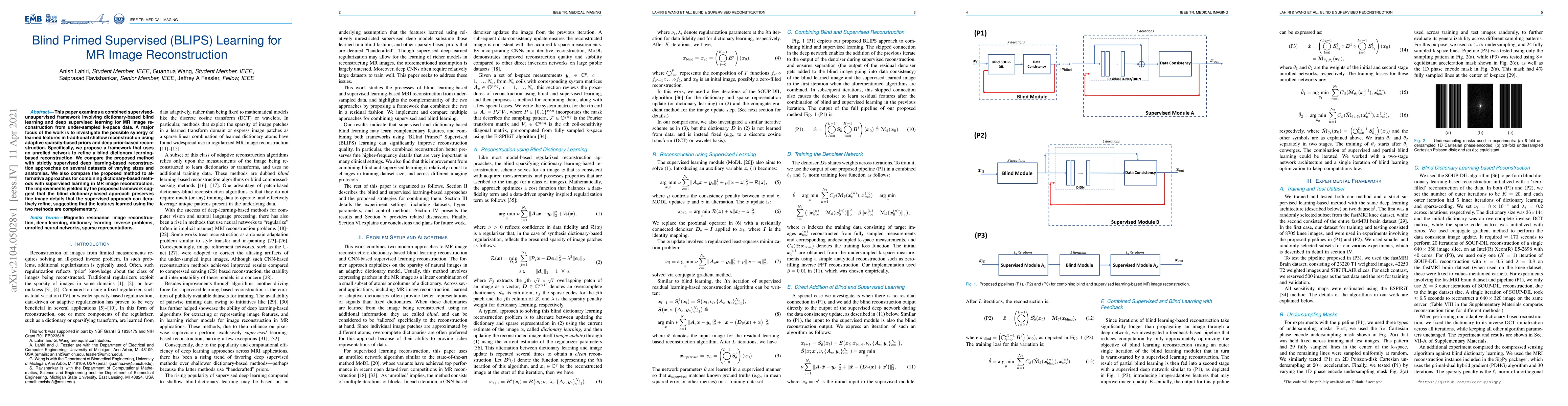 This paper proposes a BLIPS learning framework combining dictionary-based blind learning and deep supervised learning for MR image reconstruction, showing that it preserves fine image details and complements supervised methods. The framework uses an unrolled network to refine blind dictionary learning, outperforming strictly supervised deep learning approaches.
