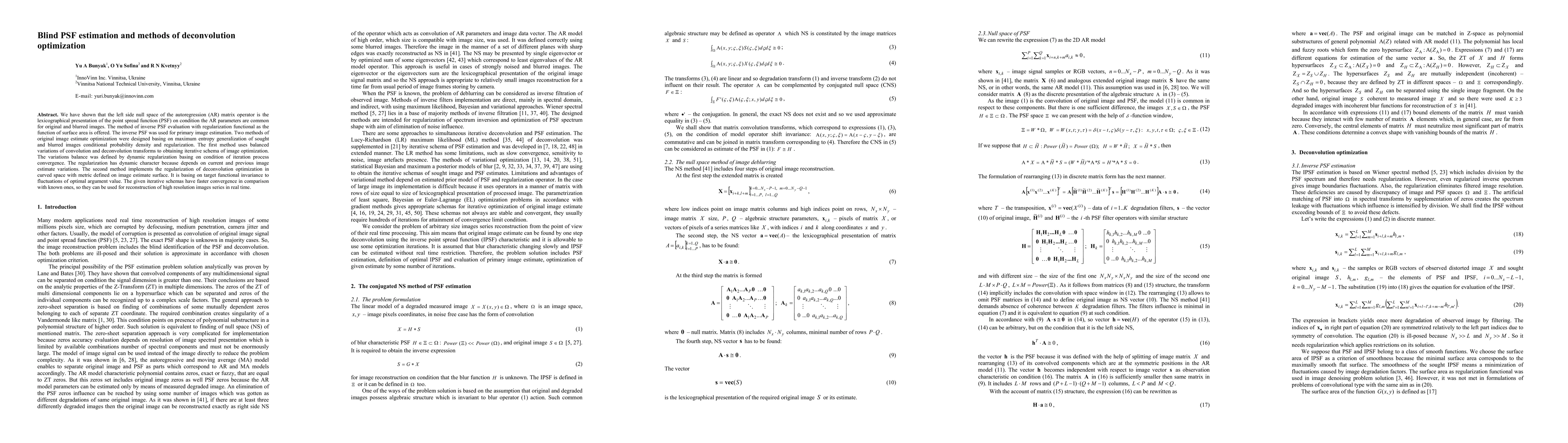 We have shown that the left side null space of the autoregression (AR) matrix operator is the lexicographical presentation of the point spread function (PSF) on condition the AR parameters are common for original and blurred images. The method of inverse PSF evaluation with regularization functional as the function of surface area is offered. The inverse PSF was used for primary image estimation. Two methods of original image estimate optimization were designed basing on maximum entropy generalization of sought and blurred images conditional probability density and regularization. The first method uses balanced variations of convolution and deconvolution transforms to obtaining iterative schema of image optimization. The variations balance was defined by dynamic regularization basing on condition of iteration process convergence. The regularization has dynamic character because depends on current and previous image estimate variations. The second method implements the regularization of deconvolution optimization in curved space with metric defined on image estimate surface. It is basing on target functional invariance to fluctuations of optimal argument value. The given iterative schemas have faster convergence in comparison with known ones, so they can be used for reconstruction of high resolution images series in real time.