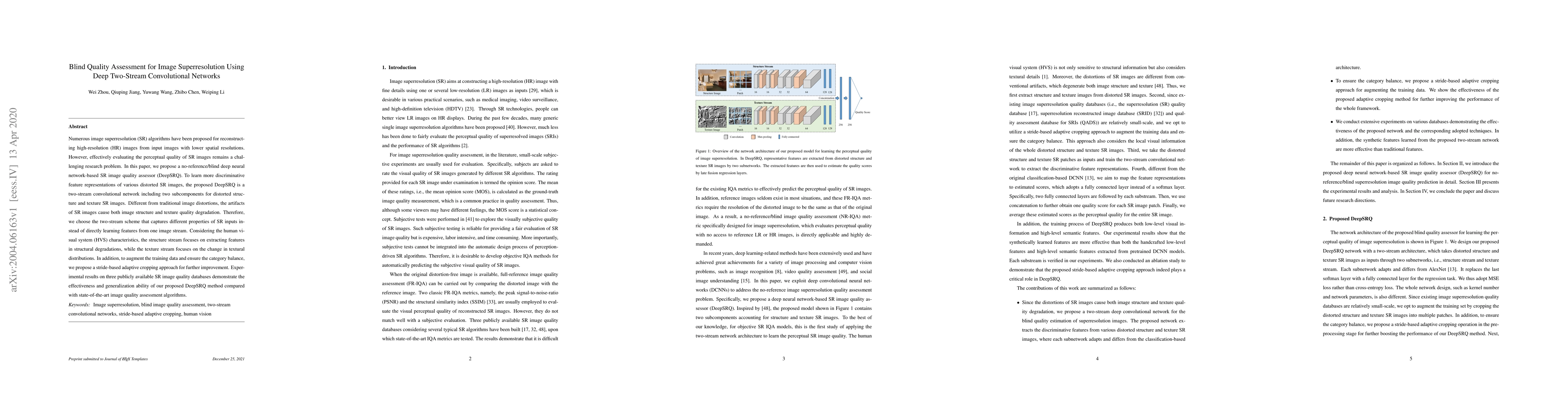 This paper proposes a blind quality assessment method, DeepSRQ, for image superresolution using a deep two-stream convolutional network to evaluate perceptual quality by separately analyzing structural and textural distortions. Experimental results show its effectiveness compared to state-of-the-art methods.