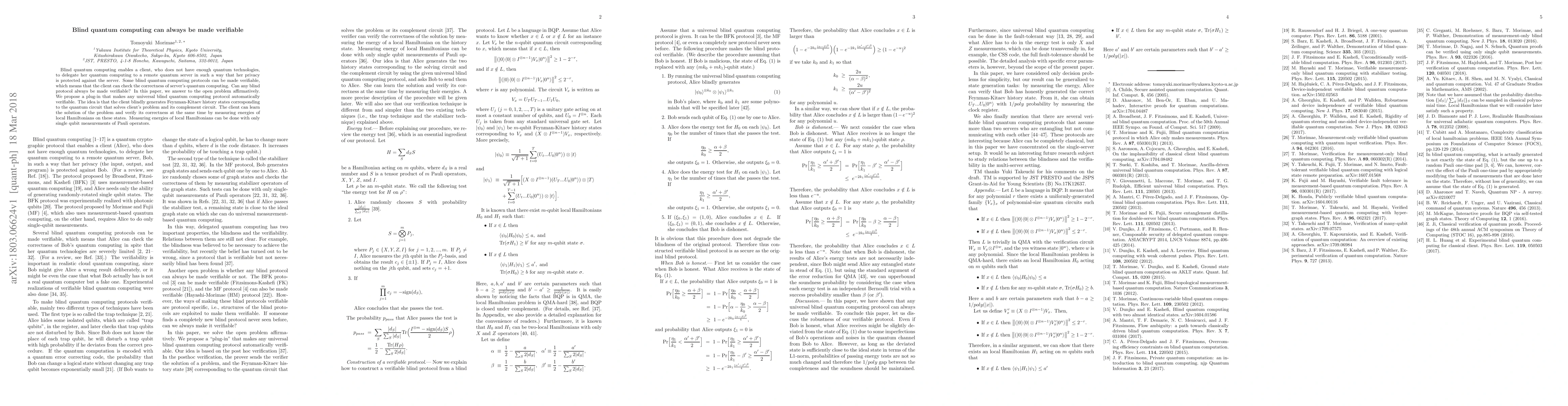Title: Blind quantum computing can always be made verifiable Summary: The paper proposes a method to render any universal blind quantum computing protocol verifiable, by generating Feynman-Kitaev history states and measuring energies of local Hamiltonians using single qubit Pauli operators to ensure correctness without compromising privacy.
