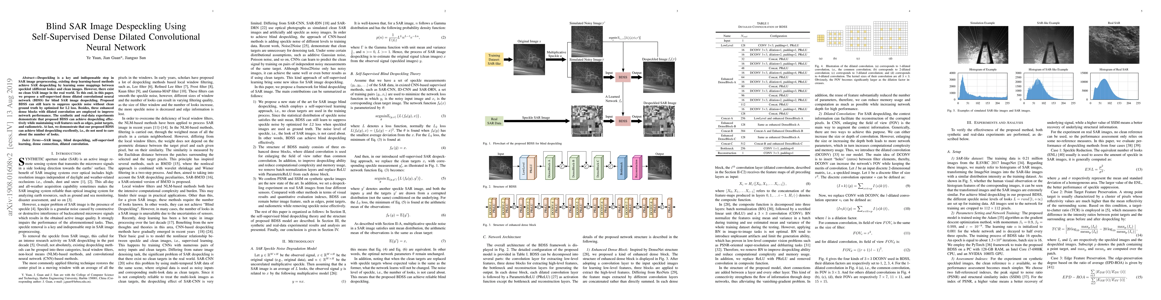 This paper proposes a self-supervised dense dilated convolutional neural network (BDSS) for blind SAR image despeckling, achieving effective noise reduction without clean ground truth by optimizing L2 loss. The method employs enhanced dense blocks with dilated convolution to maintain important features like edges and point targets.
