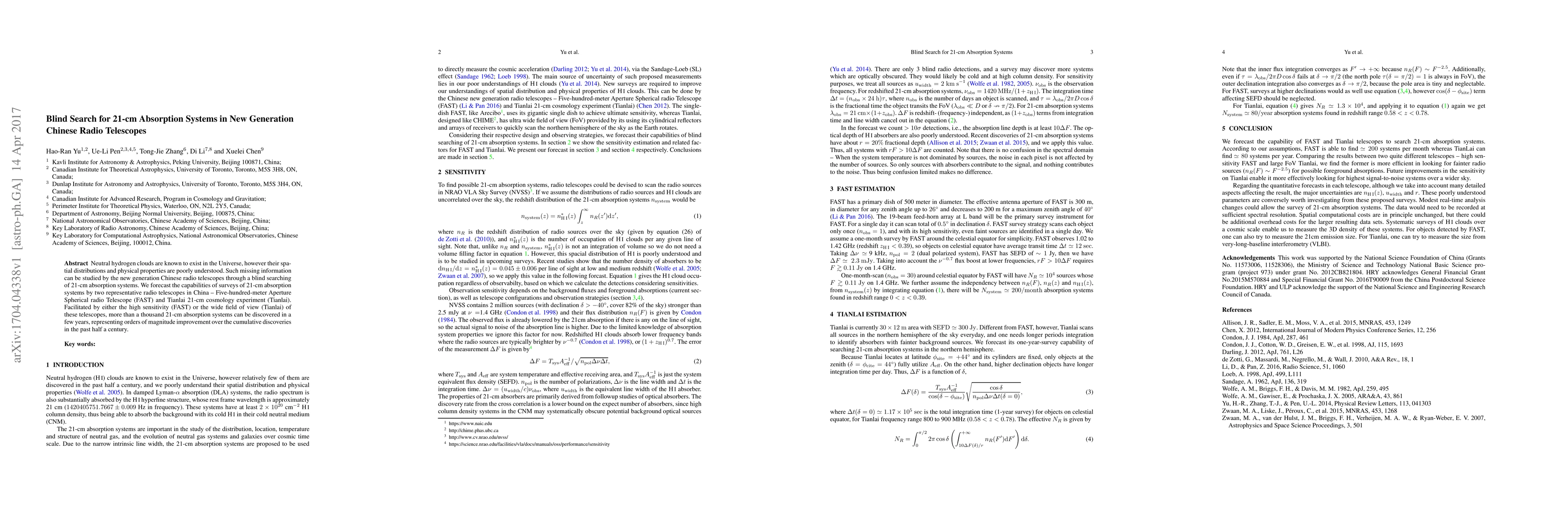 This research forecasts that China's new radio telescopes, FAST and Tianlai, can discover over a thousand 21-cm absorption systems in a few years, significantly increasing past detections and aiding the study of neutral hydrogen cloud distributions and properties in the Universe.