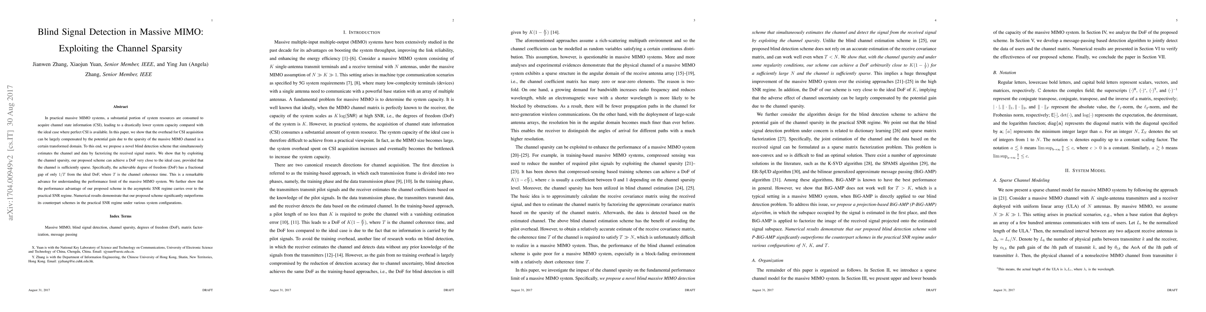 This paper proposes a novel blind detection scheme for massive MIMO systems that estimates both the channel and data by exploiting the channel's sparsity, achieving near-ideal degrees of freedom (DoF) with a small fractional gap. The scheme significantly outperforms existing methods in practical SNR conditions, demonstrating substantial gains over traditional CSI acquisition methods.