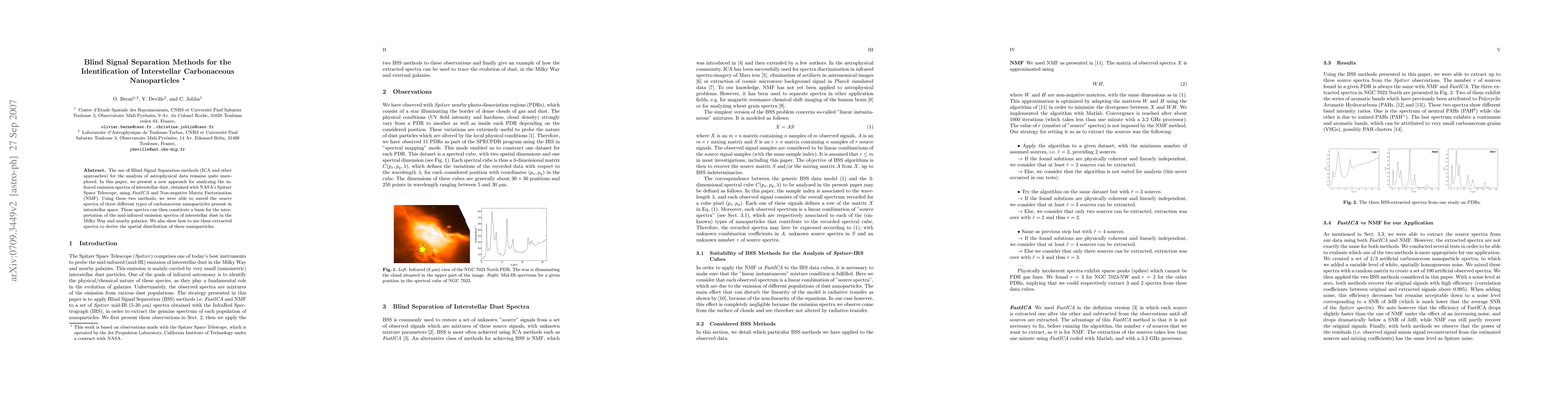 The use of Blind Signal Separation methods (ICA and other approaches) for the analysis of astrophysical data remains quite unexplored. In this paper, we present a new approach for analyzing the infrared emission spectra of interstellar dust, obtained with NASA's Spitzer Space Telescope, using FastICA and Non-negative Matrix Factorization (NMF). Using these two methods, we were able to unveil the source spectra of three different types of carbonaceous nanoparticles present in interstellar space. These spectra can then constitute a basis for the interpretation of the mid-infrared emission spectra of interstellar dust in the Milky Way and nearby galaxies. We also show how to use these extracted spectra to derive the spatial distribution of these nanoparticles.