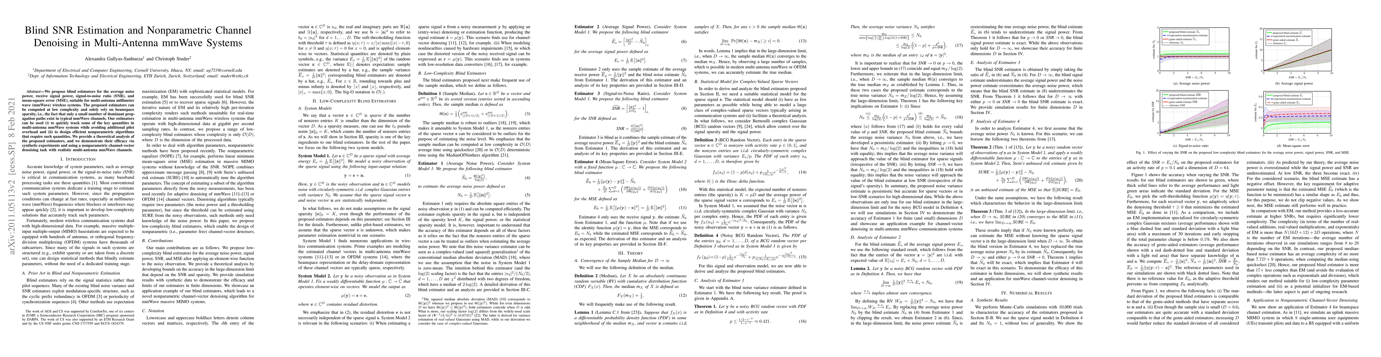 This paper proposes low-complexity blind estimators for noise power, receive signal power, SNR, and MSE in multi-antenna mmWave systems, leveraging beamspace sparsity. The estimators enable quick tracking of key system parameters without additional pilot overhead and support efficient nonparametric channel denoising.