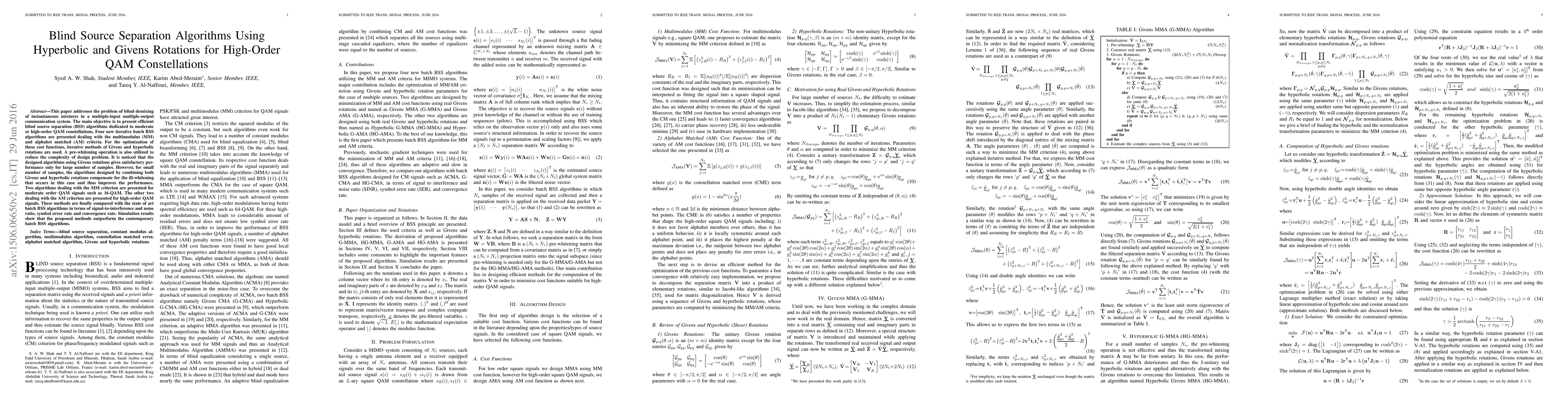 This paper introduces four new blind source separation algorithms for high-order QAM constellations using Givens and hyperbolic rotations, showing improved performance for small sample sizes. The proposed methods outperform existing algorithms in terms of signal-to-interference and noise ratio, symbol error rate, and convergence rate.