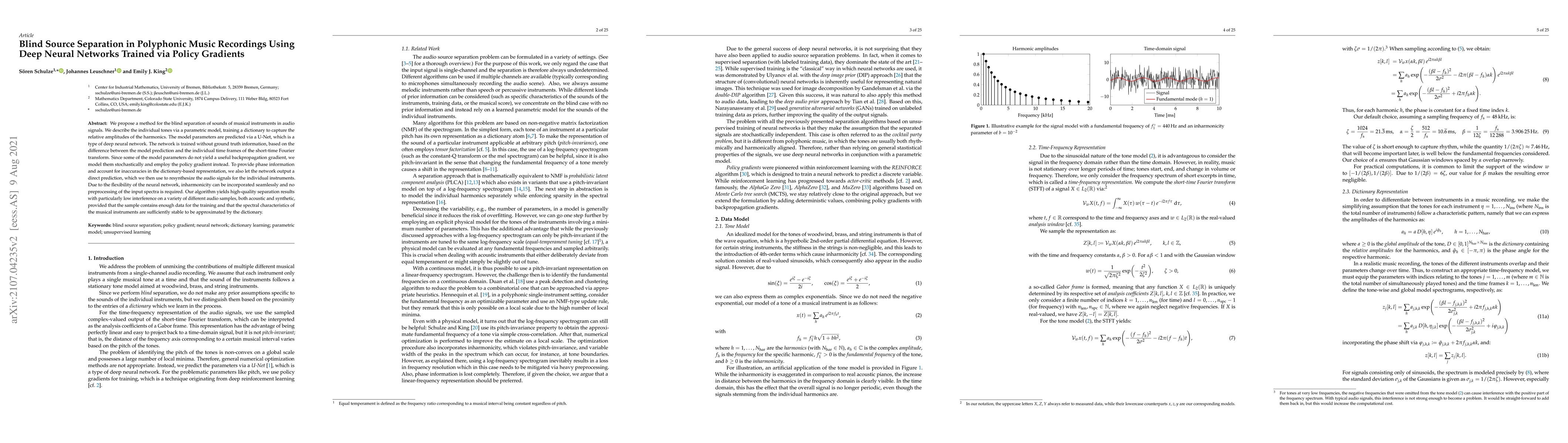 This paper proposes a deep neural network approach using U-Net and policy gradients for blind source separation of musical instruments in polyphonic recordings. The method achieves high-quality separation results without requiring ground truth information, by leveraging a dictionary to model harmonics and incorporating phase information through direct predictions.