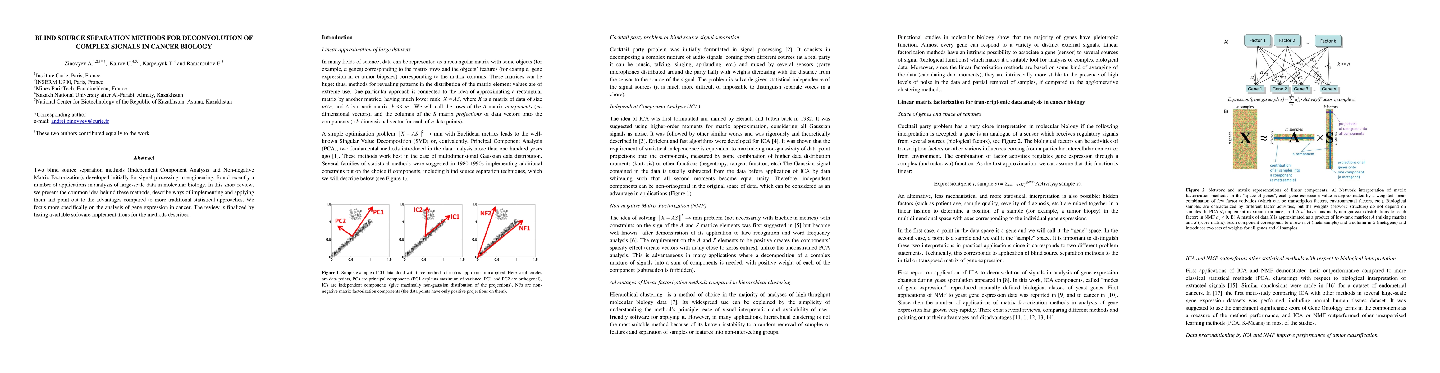 Two blind source separation methods (Independent Component Analysis and Non-negative Matrix Factorization), developed initially for signal processing in engineering, found recently a number of applications in analysis of large-scale data in molecular biology. In this short review, we present the common idea behind these methods, describe ways of implementing and applying them and point out to the advantages compared to more traditional statistical approaches. We focus more specifically on the analysis of gene expression in cancer. The review is finalized by listing available software implementations for the methods described.