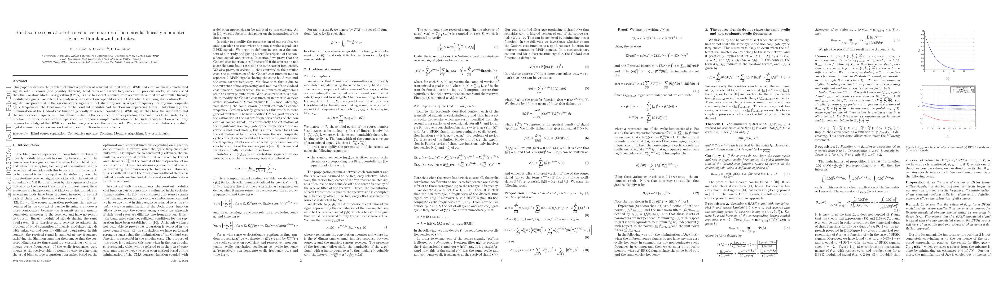 This paper explores blind separation of convolutive mixtures of BPSK and circular linearly modulated signals with unknown baud rates, extending the Constant Modulus Algorithm's capabilities. A modified Godard cost function is proposed to overcome separation failures due to non-separating local minima, validated through simulations.