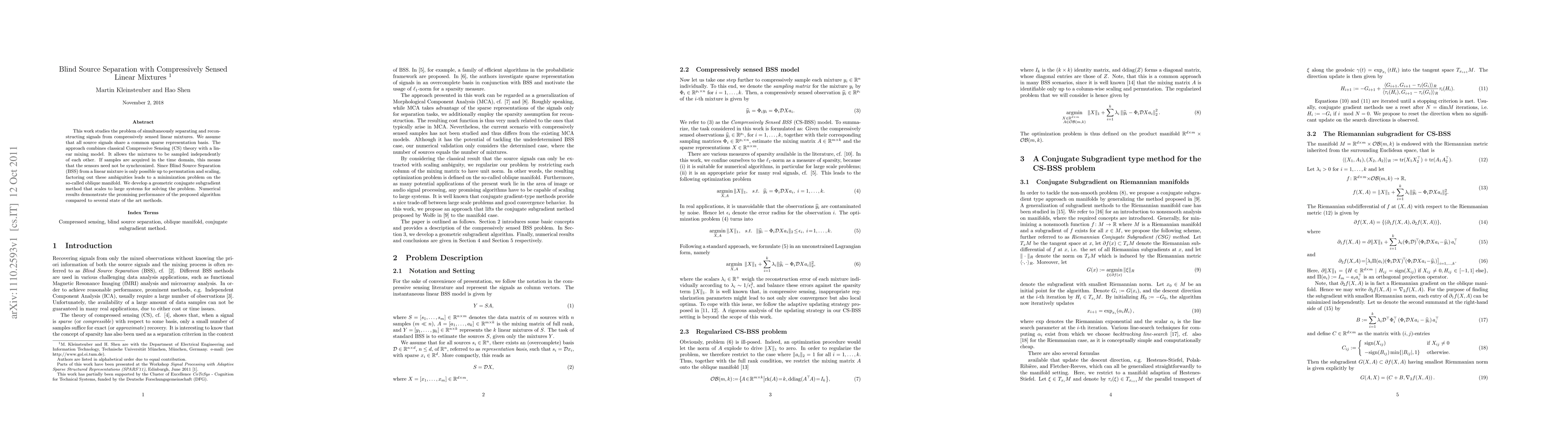 The paper combines Compressive Sensing (CS) theory with a linear mixing model for Blind Source Separation (BSS) from compressively sensed linear mixtures, assuming all source signals share a common sparse representation basis. A geometric conjugate subgradient method is developed to solve the resulting minimization problem on the oblique manifold.