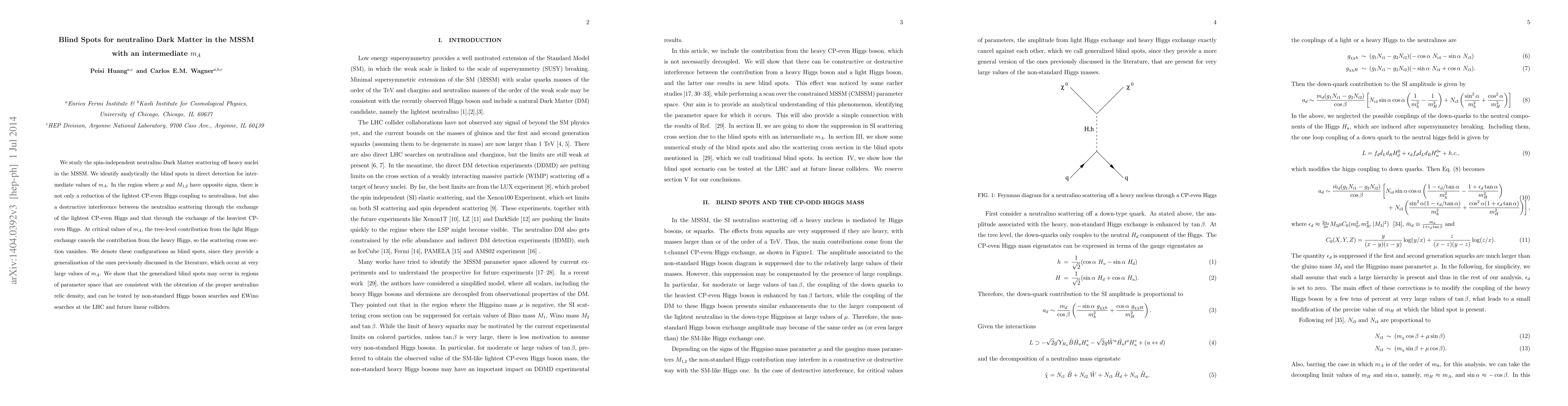 We study the spin-independent neutralino Dark Matter scattering off heavy nuclei in the MSSM. We identify analytically the blind spots in direct detection for intermediate values of $m_A$. In the region where $\mu$ and $M_{1,2}$ have opposite signs, there is not only a reduction of the lightest CP-even Higgs coupling to neutralinos, but also a destructive interference between the neutralino scattering through the exchange of the lightest CP-even Higgs and that through the exchange of the heaviest CP-even Higgs. At critical values of $m_A$, the tree-level contribution from the light Higgs exchange cancels the contribution from the heavy Higgs, so the scattering cross section vanishes. We denote these configurations as blind spots, since they provide a generalization of the ones previously discussed in the literature, which occur at very large values of $m_A$. We show that the generalized blind spots may occur in regions of parameter space that are consistent with the obtention of the proper neutralino relic density, and can be tested by non-standard Higgs boson searches and EWino searches at the LHC and future linear colliders.