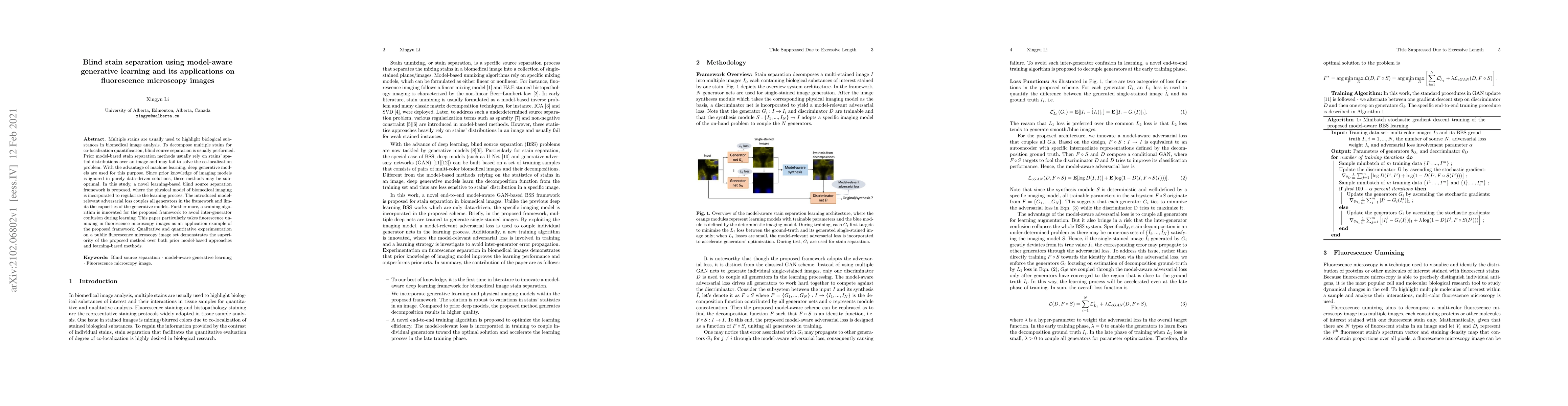 This paper proposes a novel generative learning framework for blind stain separation in fluorescence microscopy images, incorporating physical imaging models to enhance separation accuracy. The method demonstrates superior performance over both traditional model-based and purely data-driven approaches in fluorescence unmixing tasks.