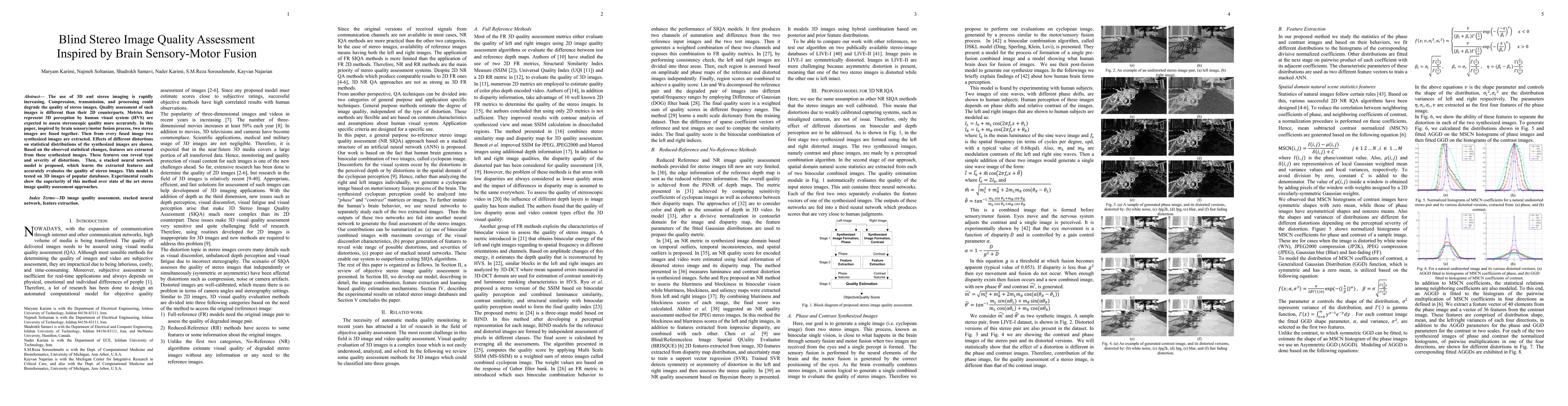 A novel method for assessing stereo image quality is proposed, inspired by brain sensory-motor fusion, which uses stacked neural networks to extract features from synthesized images that reveal distortion effects.