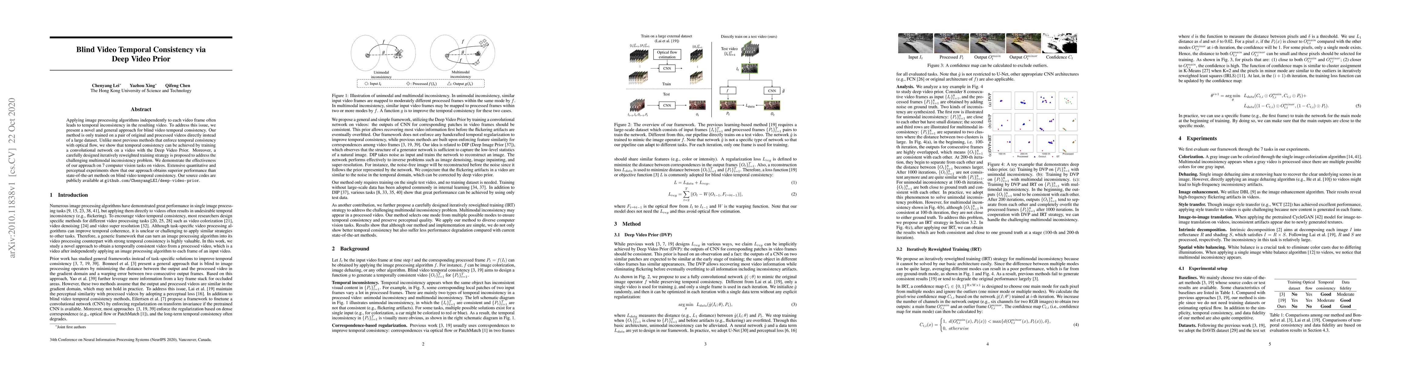 This paper introduces a novel approach for achieving blind video temporal consistency using a Deep Video Prior, eliminating the need for large datasets or optical flow enforcement. The method employs an iteratively reweighted training strategy to handle multimodal inconsistencies, demonstrating superior performance across 7 computer vision tasks.