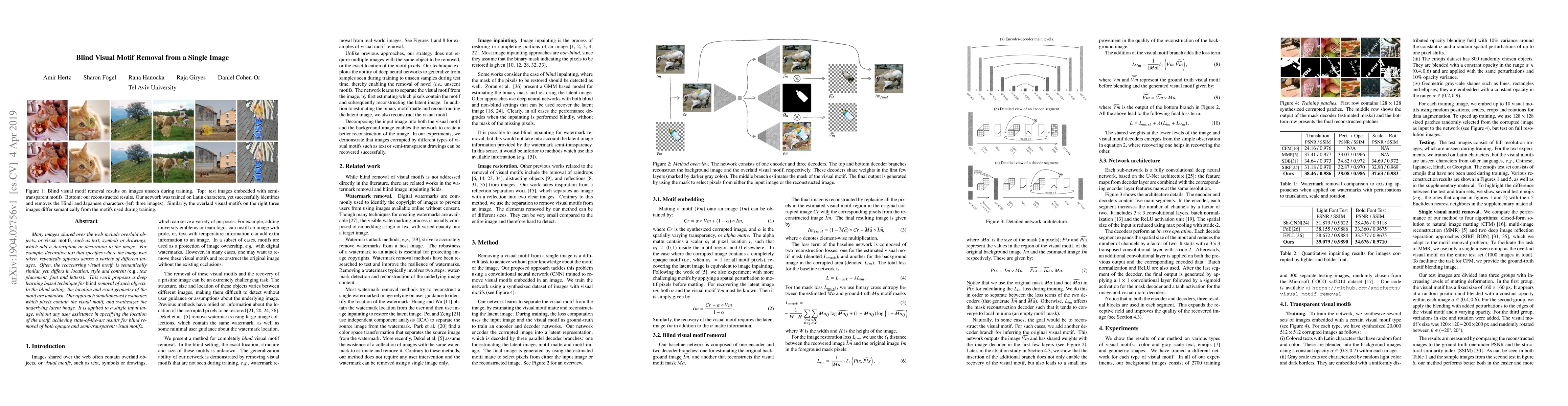 Many images shared over the web include overlaid objects, or visual motifs, such as text, symbols or drawings, which add a description or decoration to the image. For example, decorative text that specifies where the image was taken, repeatedly appears across a variety of different images. Often, the reoccurring visual motif, is semantically similar, yet, differs in location, style and content (e.g. text placement, font and letters). This work proposes a deep learning based technique for blind removal of such objects. In the blind setting, the location and exact geometry of the motif are unknown. Our approach simultaneously estimates which pixels contain the visual motif, and synthesizes the underlying latent image. It is applied to a single input image, without any user assistance in specifying the location of the motif, achieving state-of-the-art results for blind removal of both opaque and semi-transparent visual motifs.
